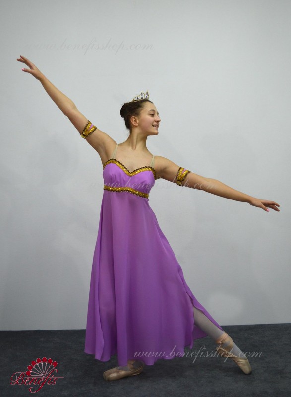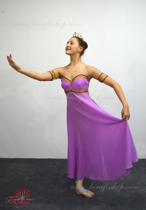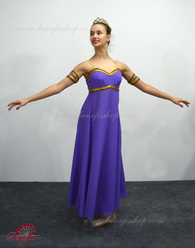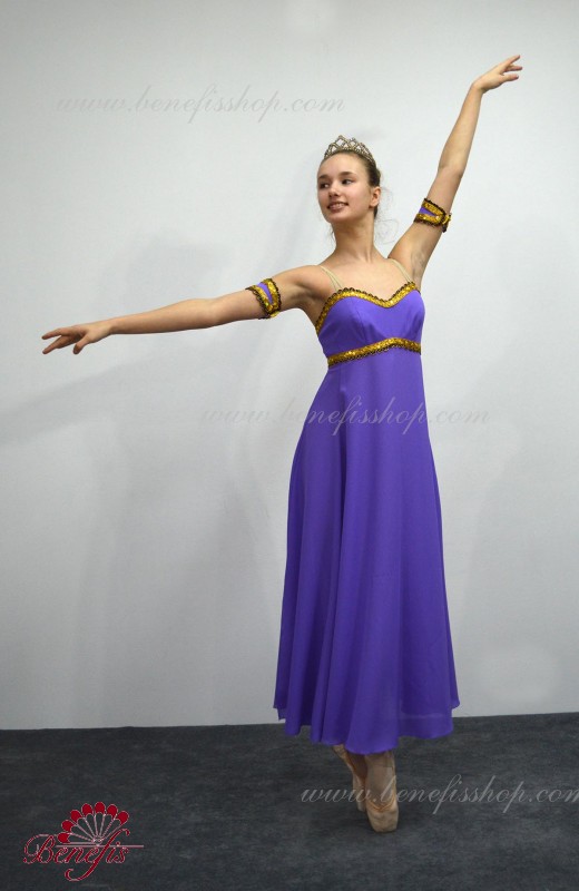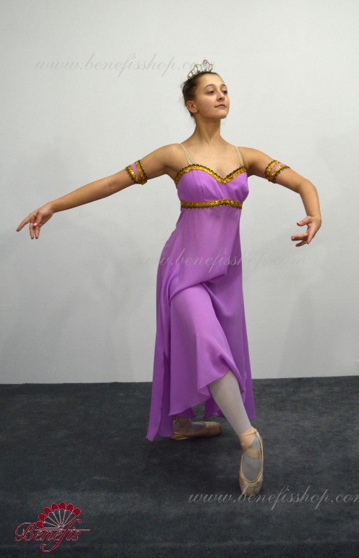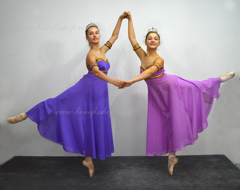 Это профессиональное балетное платье с завышенной кокеткой выполнено на основе бифлексового купальника. Лиф в области груди выполнен из эластичного бархата, он оторочен широкой золотой тесьмой и украшен блестками, бусами, тесьмой-шнуром, стразами.