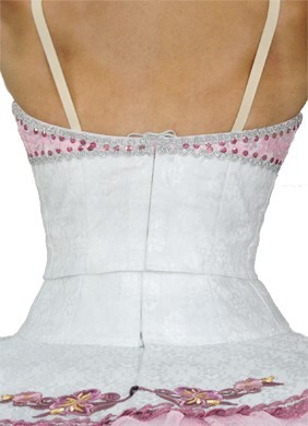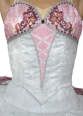 Лиф выполнен из плотной полуэластичной ткани продублирован гипюром, на груди исползуется две вставки , декорирован блестками, камнями, аликацами, тесьмой. Лиф застегивается на крючки в два ряда для удобного регулирования, а внутренний шнур служит для затягивания лифа в области груди.
