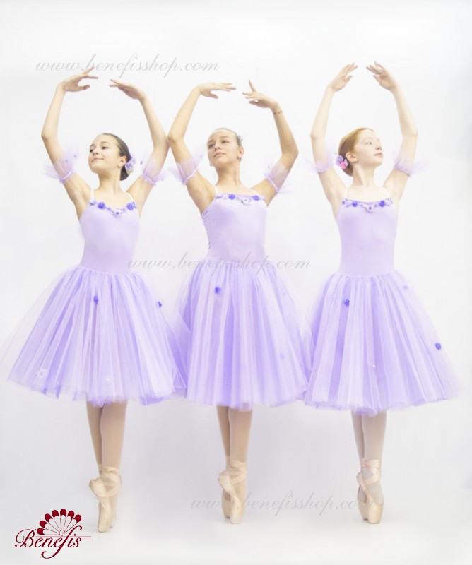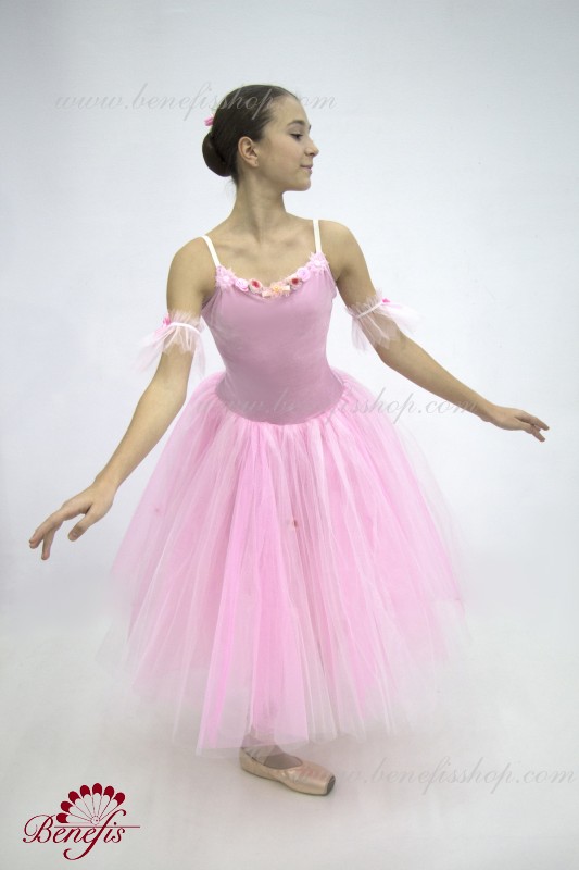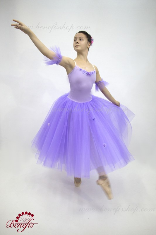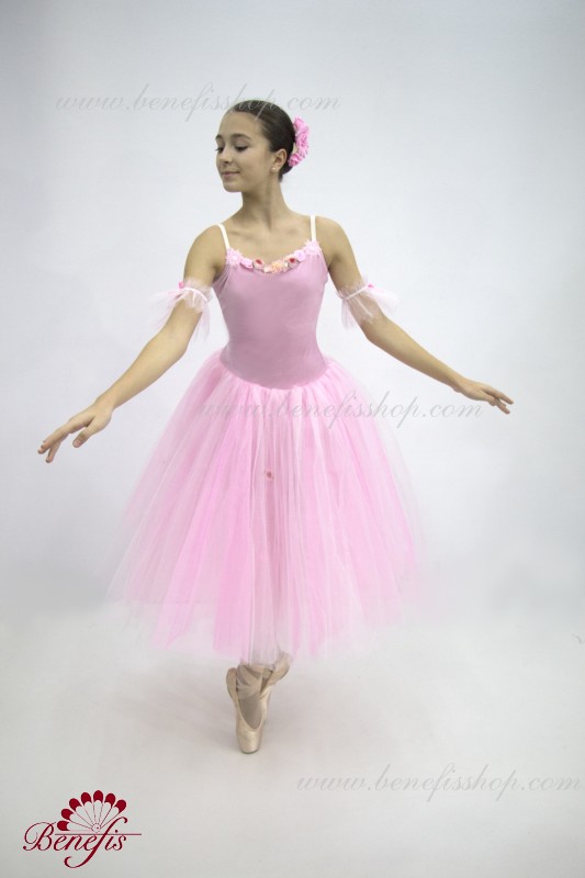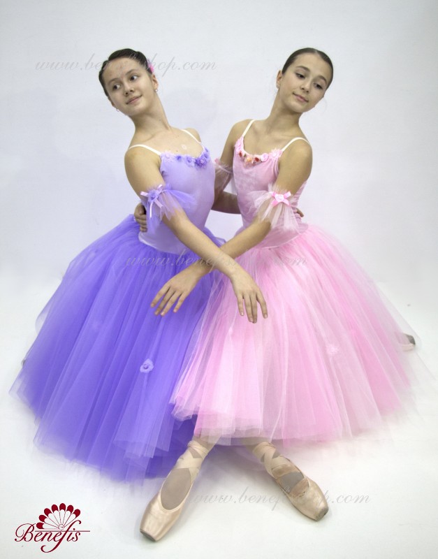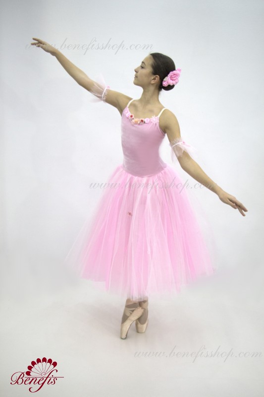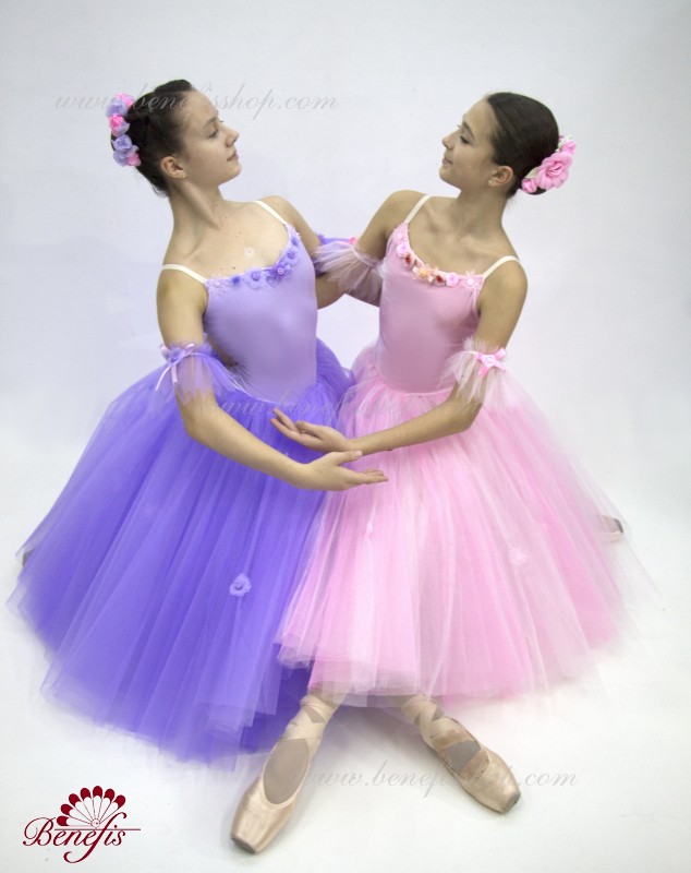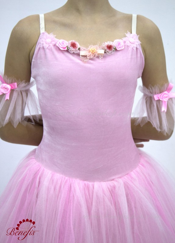 Детали: платье, рукавчики. Это профессиональный балетный, сценический костюм. Изготовлен из эластичного бифлекса нежного тюля. Купальник основан на базовой модели A0001. В качестве декора используются цветочки и бантики. Юбка из четырех слоев мягкого и плотного фатина.