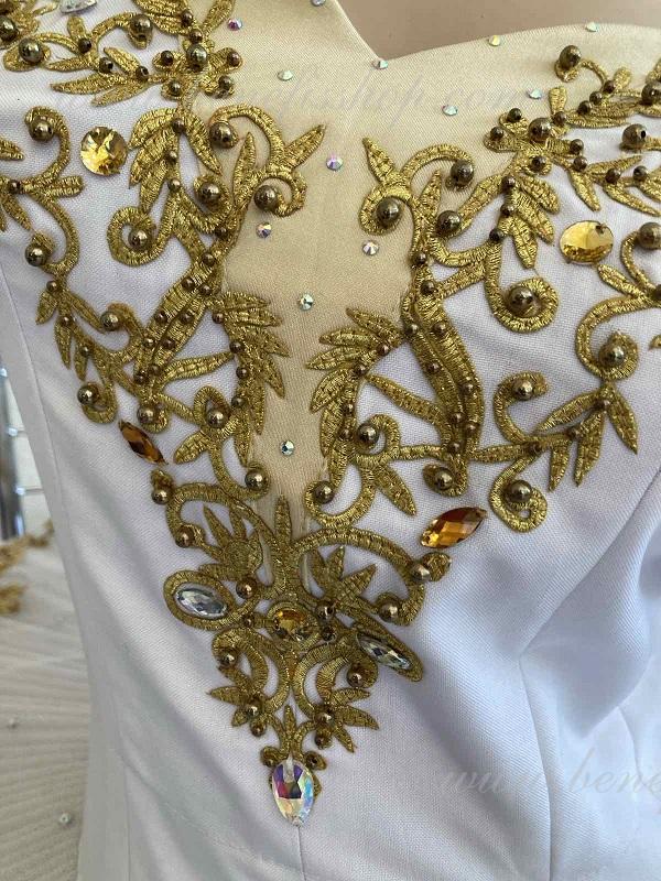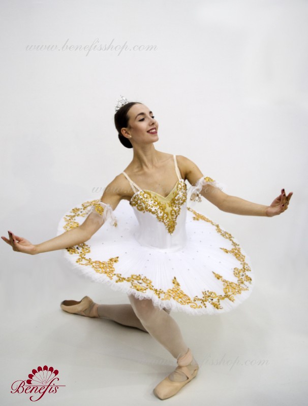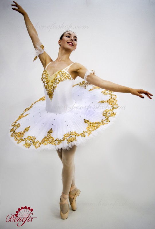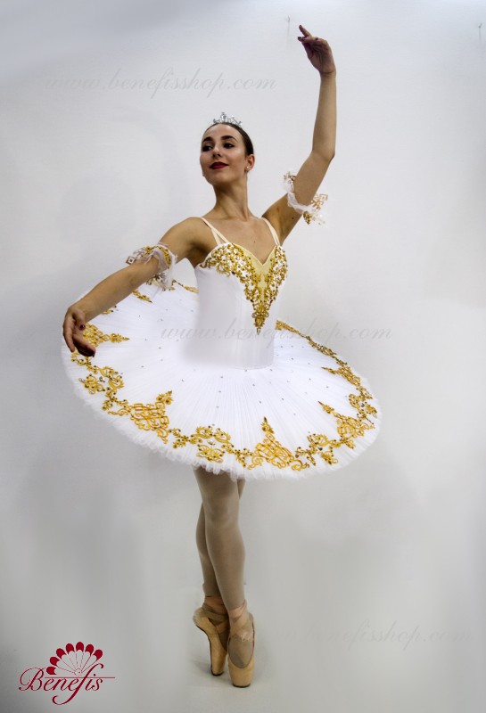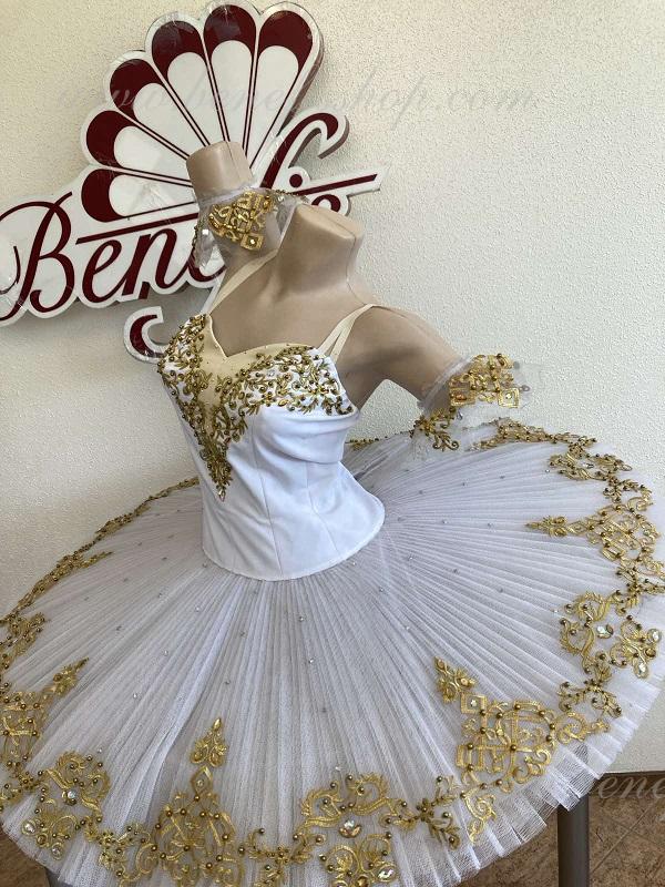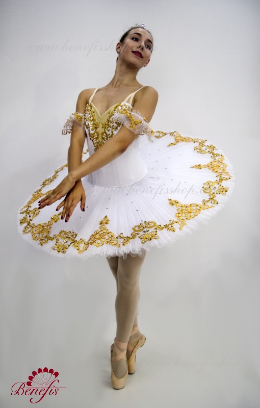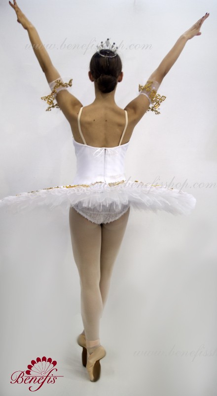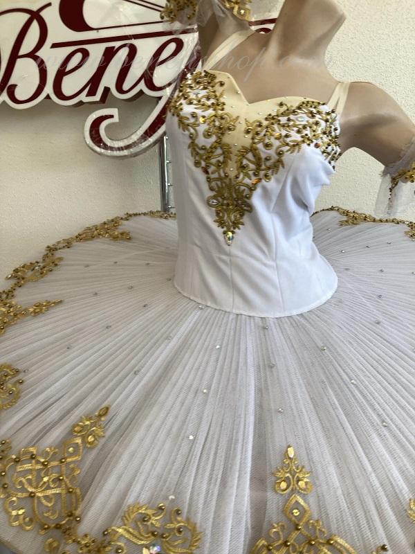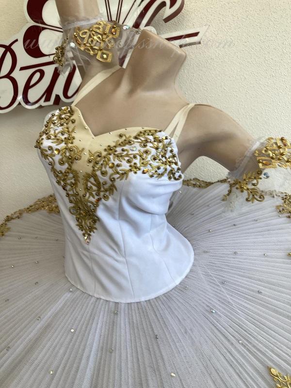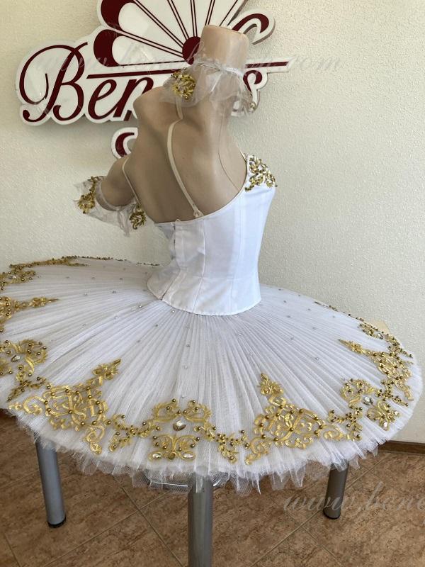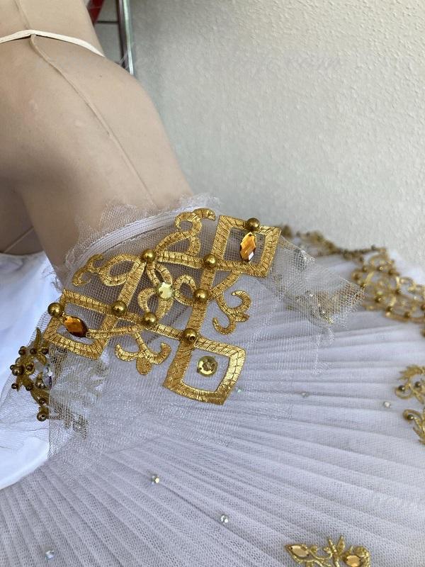 Это профессиональный сценический балетный костюм. Лиф выполнен из полу эластичной плотной ткани застёгивается на спинке на два ряда крючков и петель. Для удобного регулирования лиф можно затянуть шнуркам в области груди. Имеются пышные длинные рукава из более нежной ткани. Низ изделия выполнен из двух слоёв шифона.