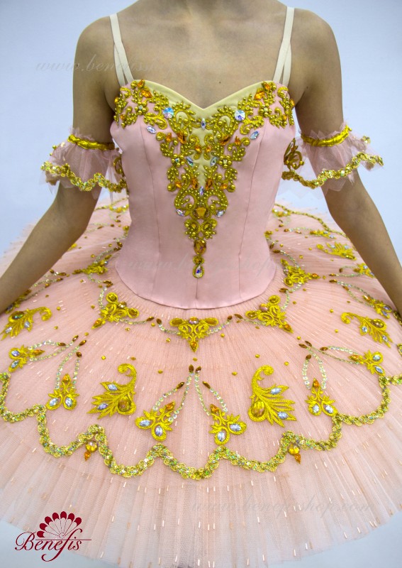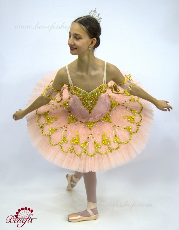 Т 0009 на эластичных лямках и с телесной вставкой на груди, выполнен из плотной полу эластичной ткани. Лиф застегивается на крючки в два ряда, для удобного регулирования, внутренний шнур служит для затягивания лифа в области груди. Низ изделия основан на пачке Т 0001В, который в свою очередь состоит из восьми слоев разной длины, посаженых на трусики с кокеткой, внутренний обруч внедрен в средние слои пачки. В качестве декора служит блесточная тесьма, аппликации, стразы и камни. Костюм может быть выполнен в любом цвете по