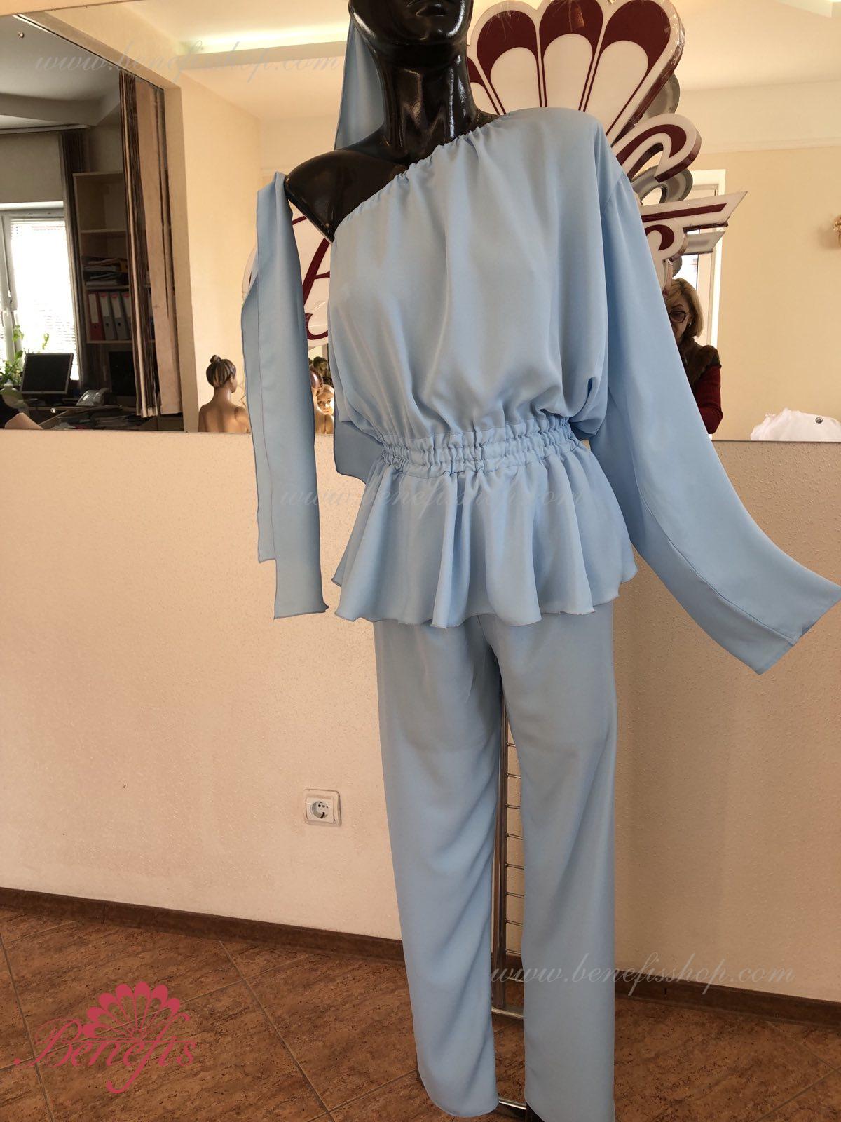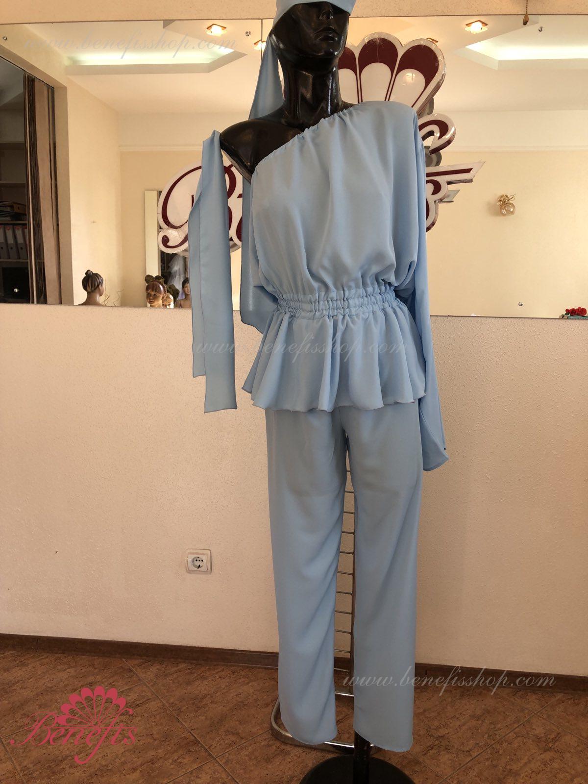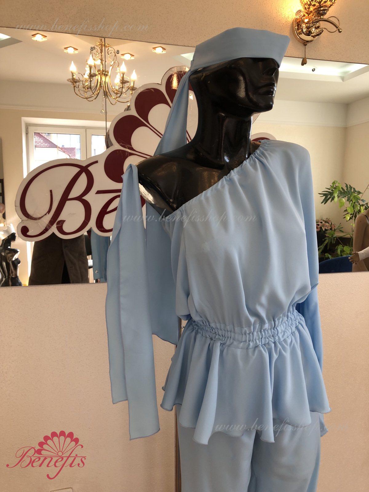 Детали: блузка, брюки, головной убор, завязка для руки. Изготовлен из шифона.