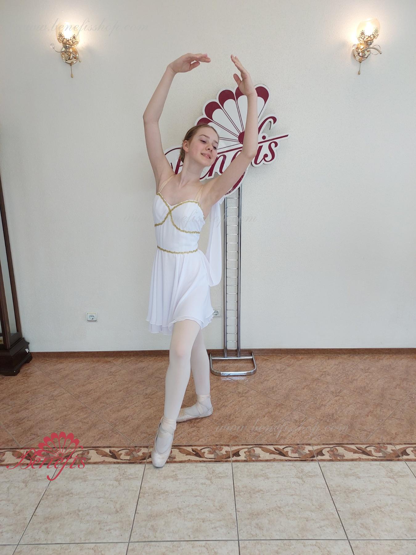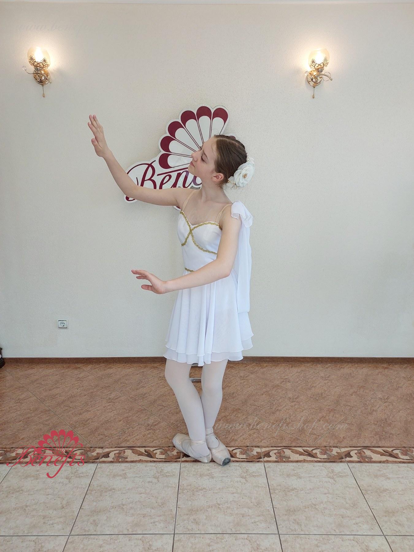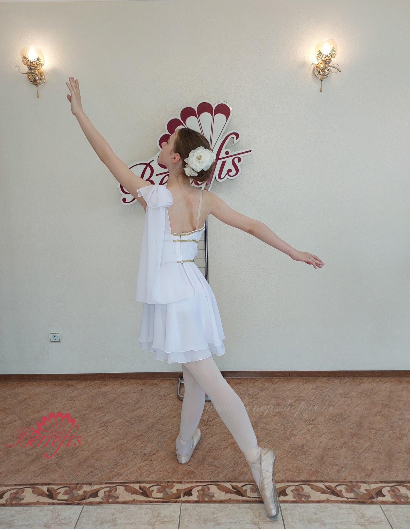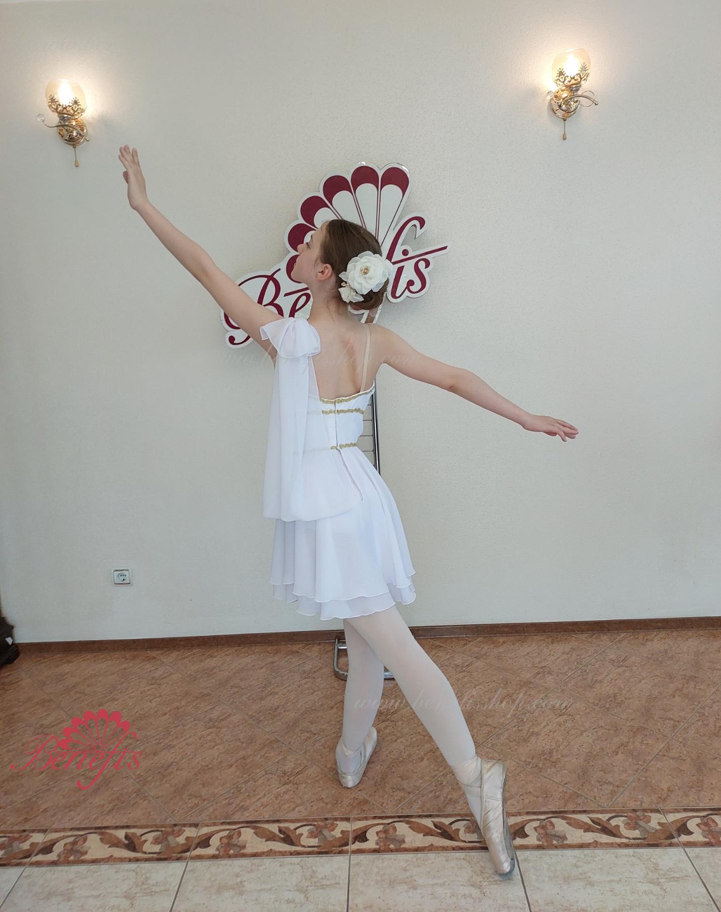 Нежное балетное платье изготовлено из лёгкого шифона и полуэластичной плотной ткани.