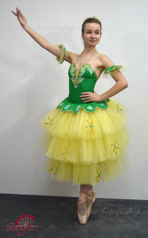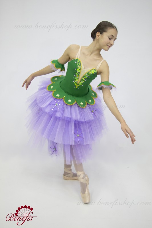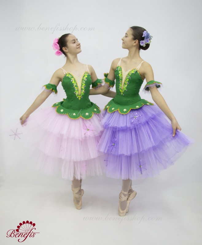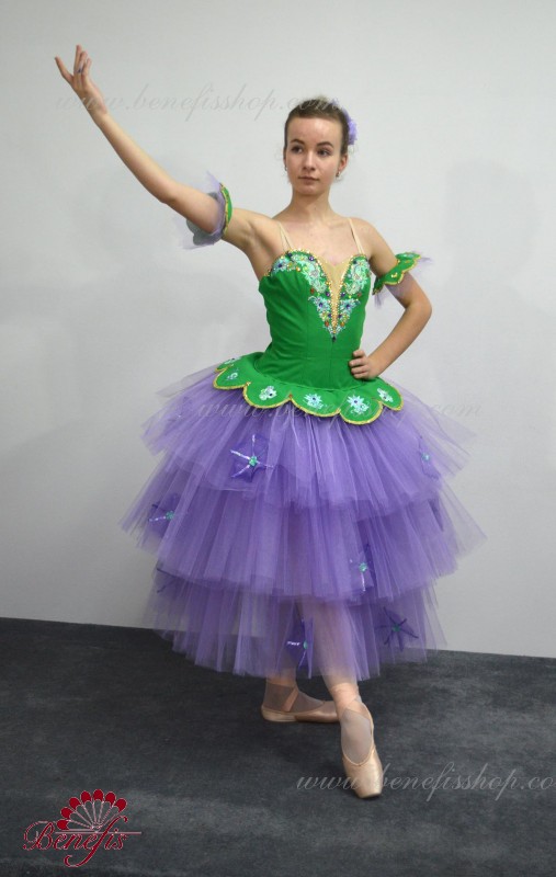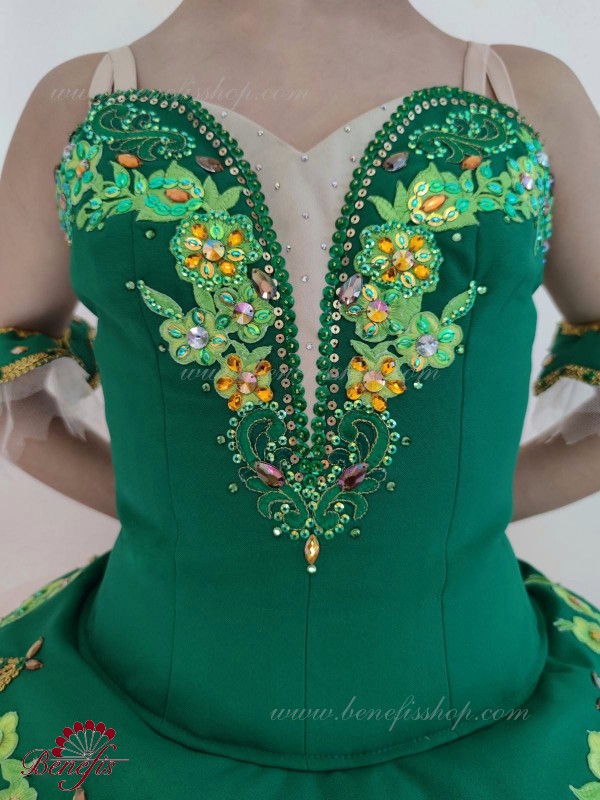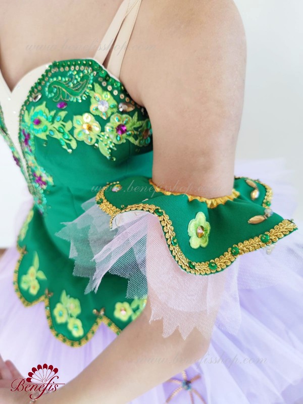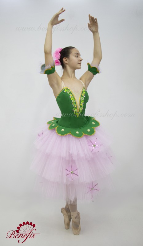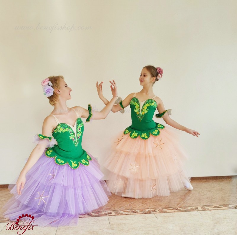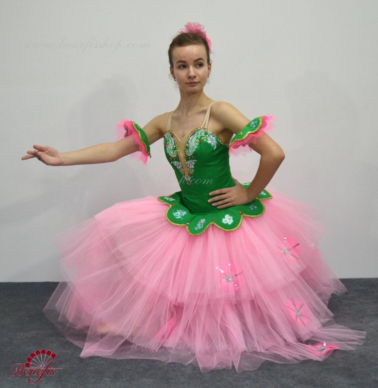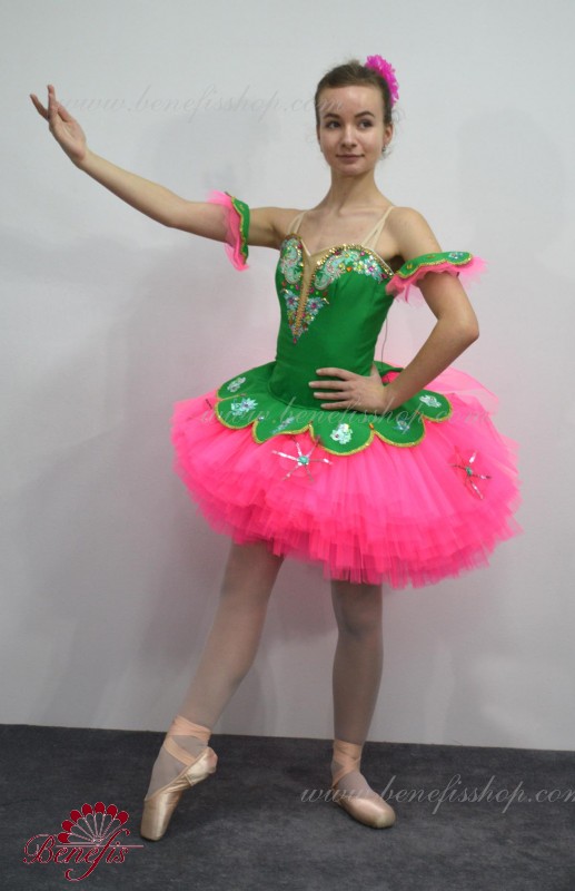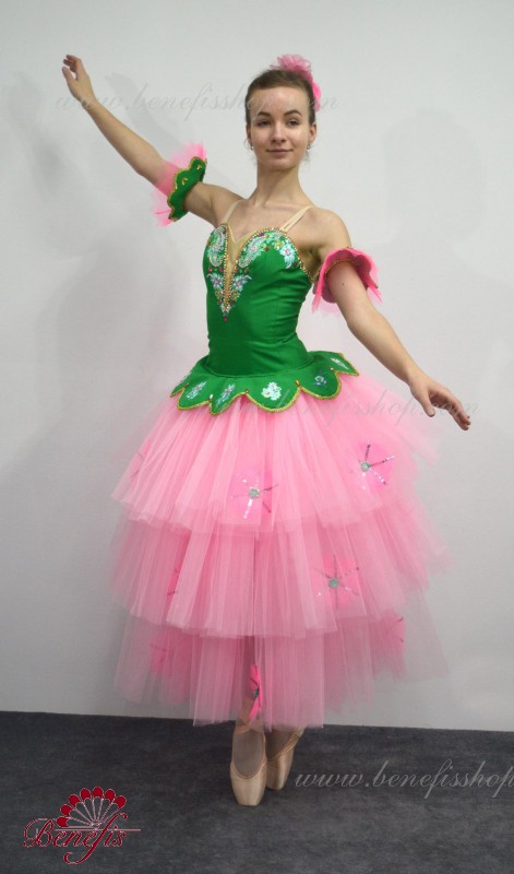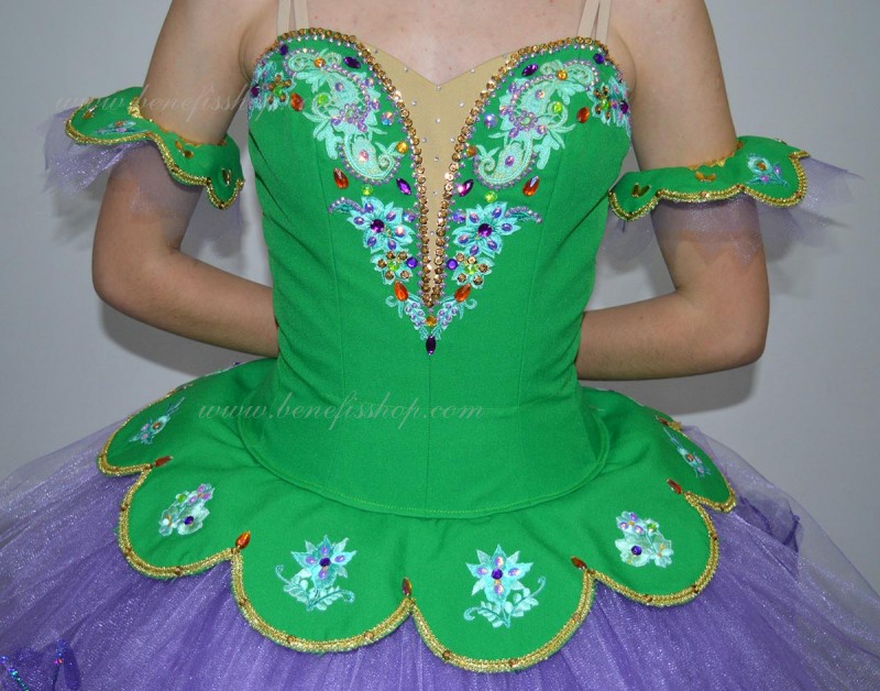 Лиф украшен аппликациями, сверкающими стразами и блестками. Богатый декор в изумрудно-розовых тонах подчеркивает нежность создаваемого образа. Костюм может быть выполнен различных цветов.