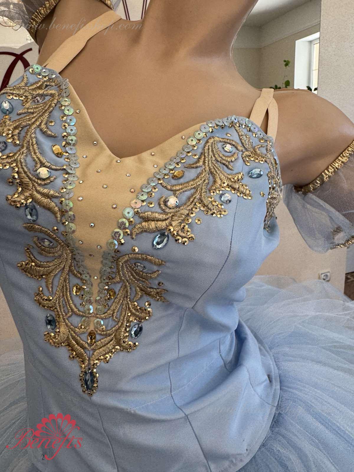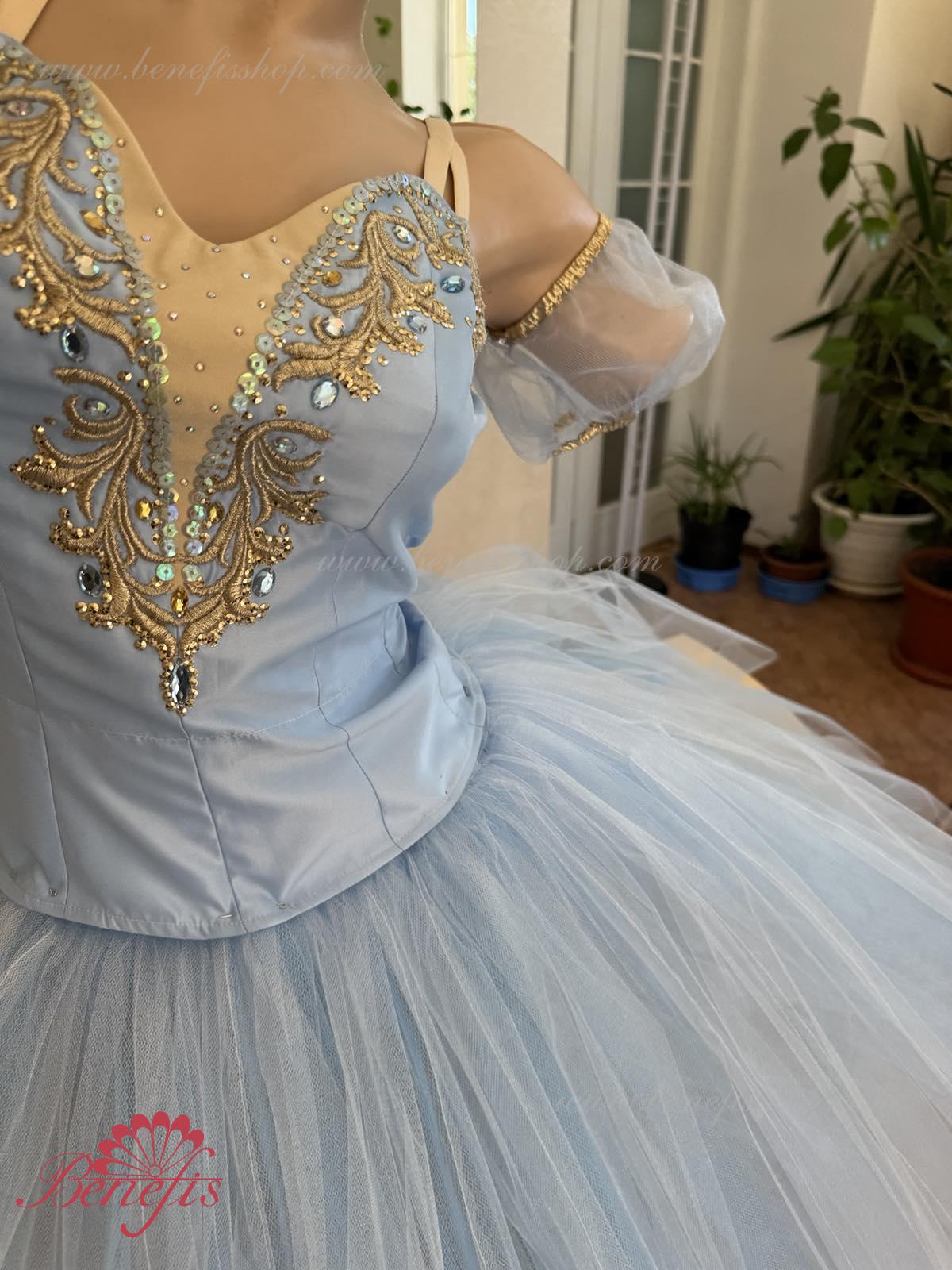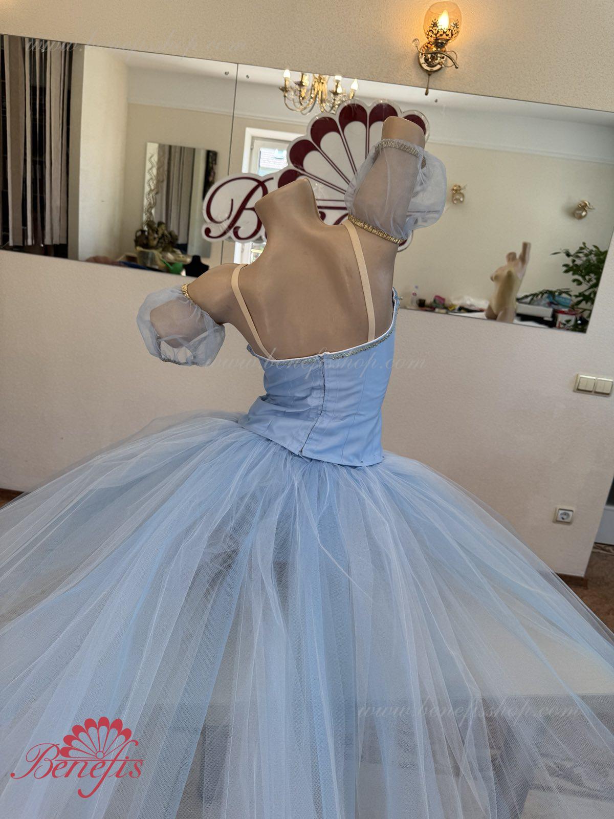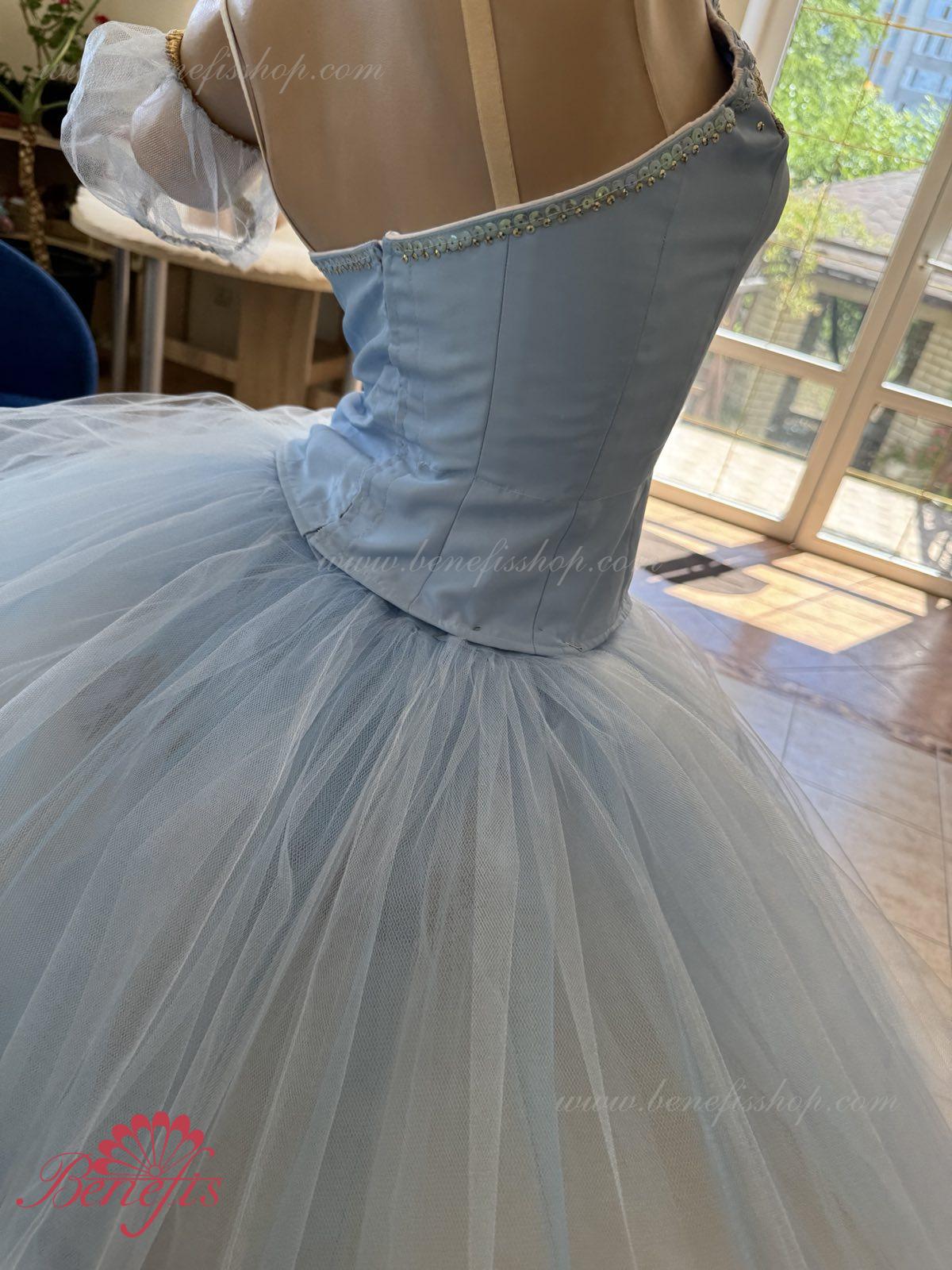 Лиф застегивается на крючки в два ряда для удобного регулирования, внутренний шнур служит для затягивания лифа в области груди. Эта воздушная романтическая базовая пачка состоит из шести слоёв мягкого и жёсткого тюля, выполненных из множества клиньев. Все слои посажены на трусики из тюля. Трусики соединены с кокеткой (7см) из тюля, прикреплённой к эластичному поясу.