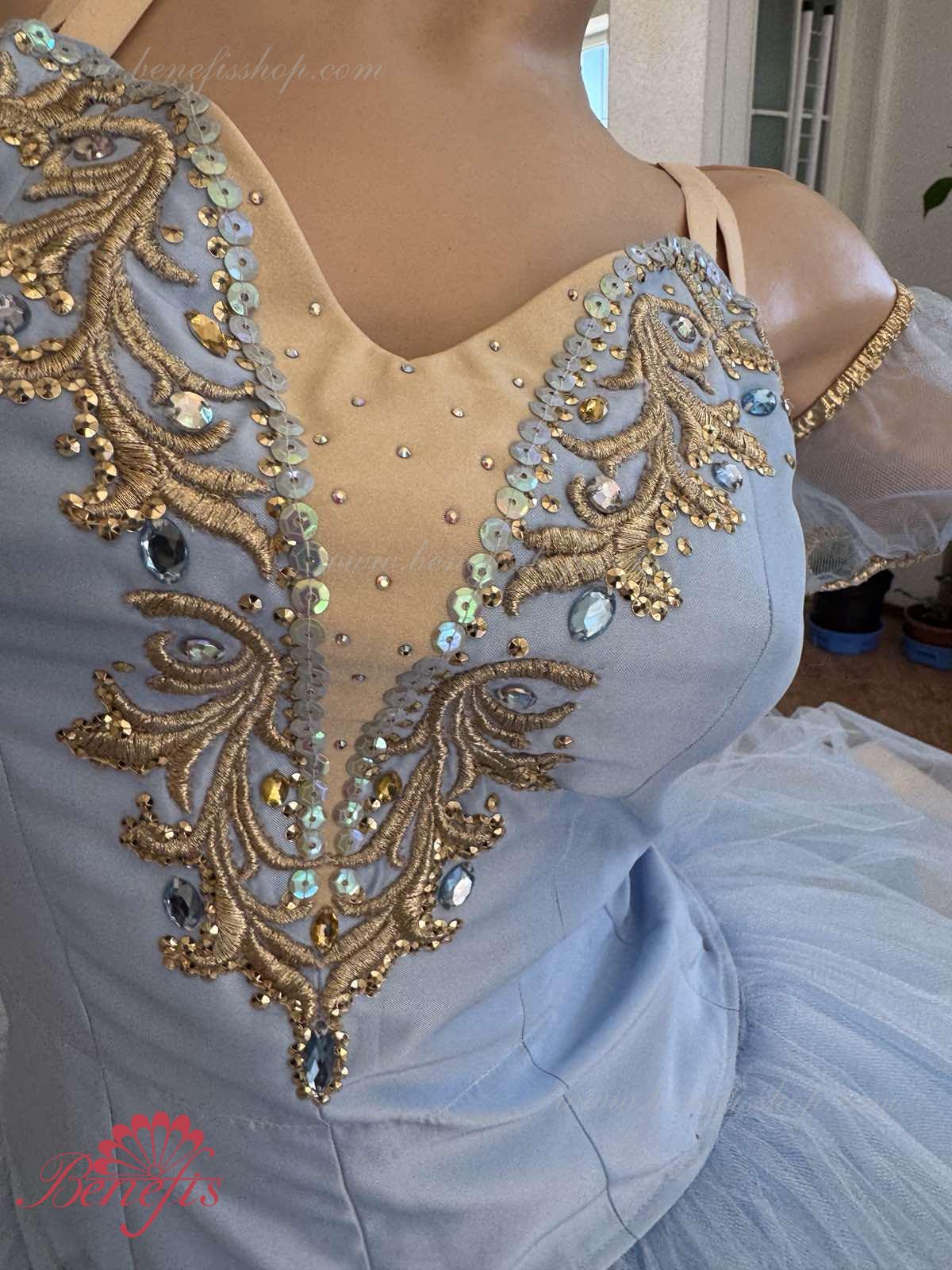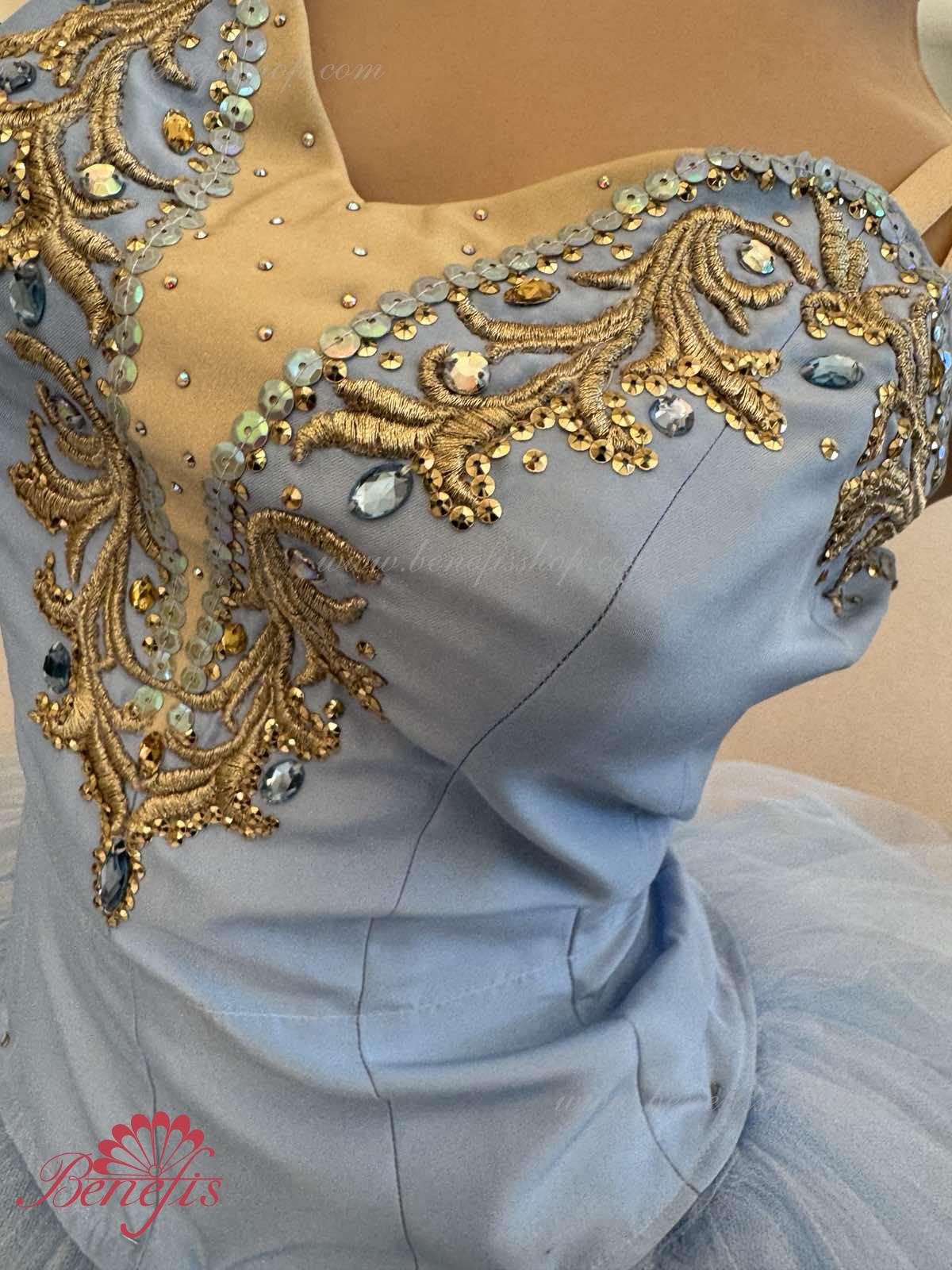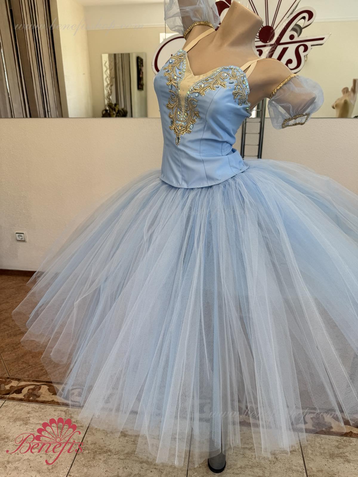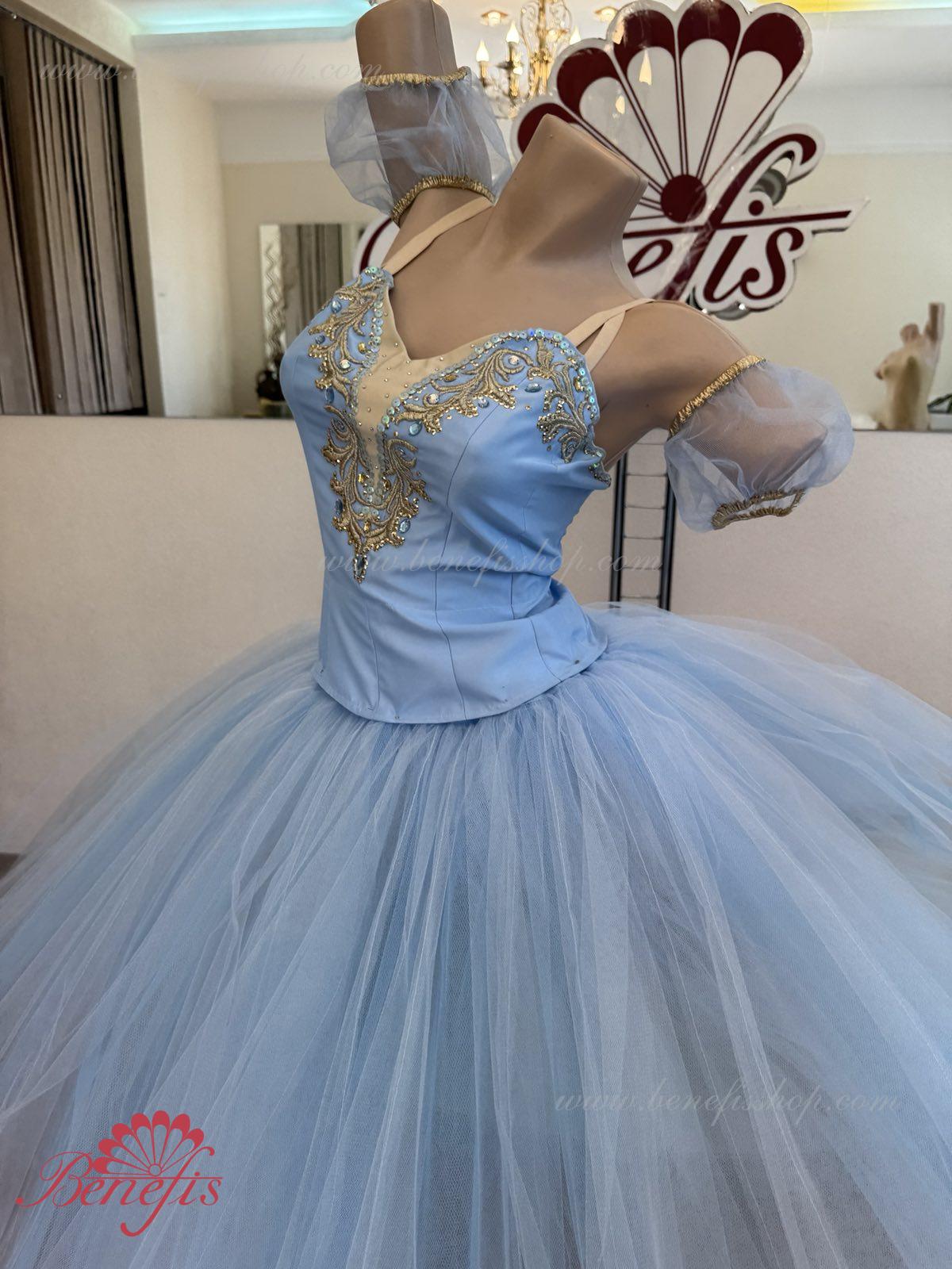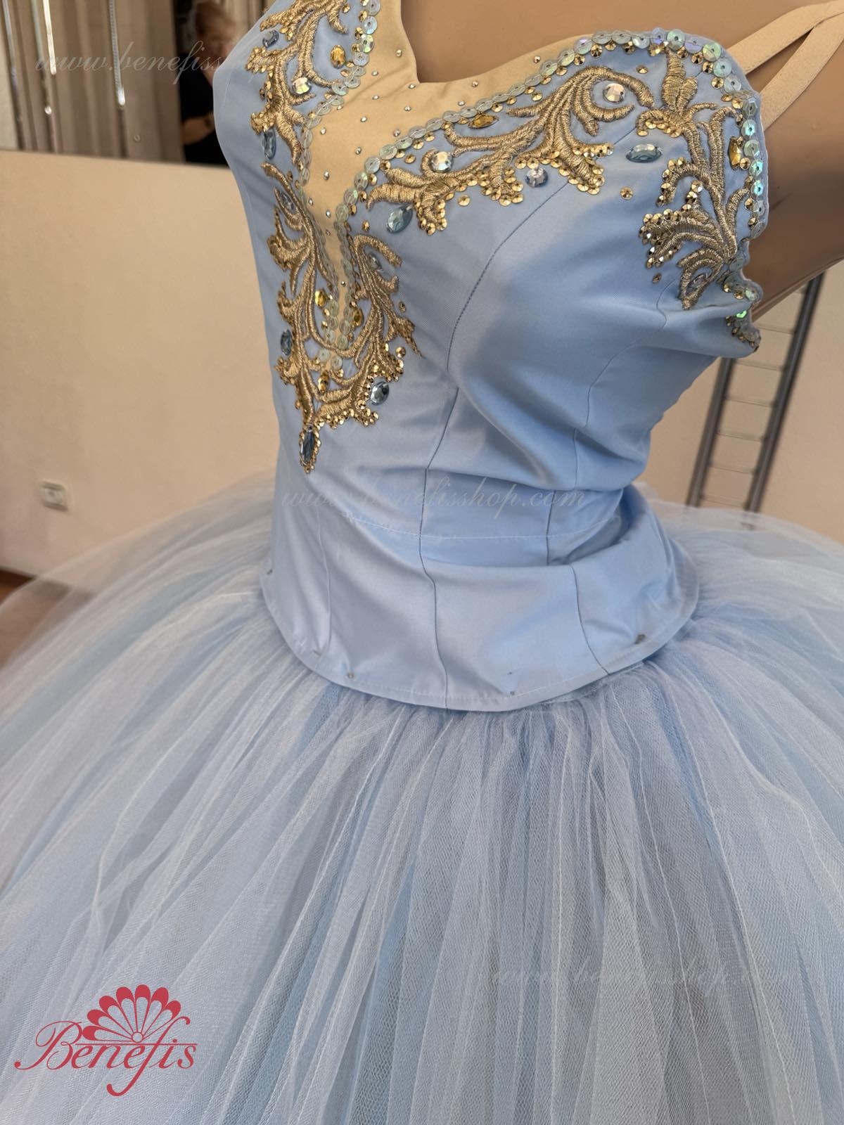 Лиф застегивается на крючки в два ряда для удобного регулирования, внутренний шнур служит для затягивания лифа в области груди. Эта воздушная романтическая базовая пачка состоит из шести слоёв мягкого и жёсткого тюля, выполненных из множества клиньев. Все слои посажены на трусики из тюля. Трусики соединены с кокеткой (7см) из тюля, прикреплённой к эластичному поясу.