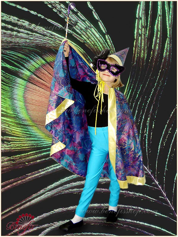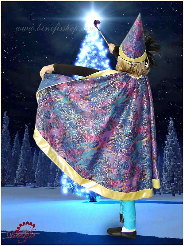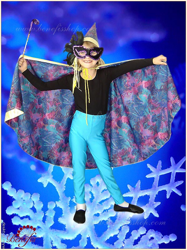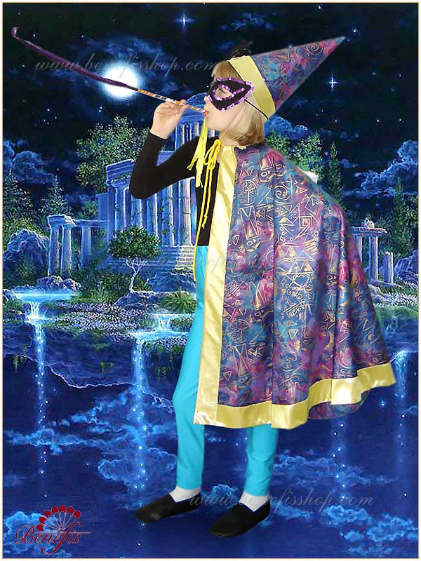 Лосины и футболка выполнены из стречевой ткани. Плащ и колпак - из ткани с набивным рисунком и оторочен золотой парчой.
