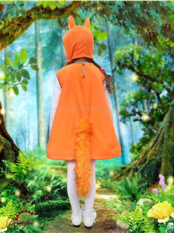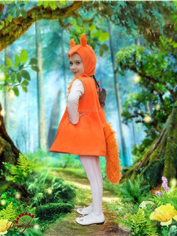 Костюм изготовлен из флиса. Украшением служит меховая вставка на груди, сзади к платью прикреплен хвост. Платье застегивается сзади на пуговицу.