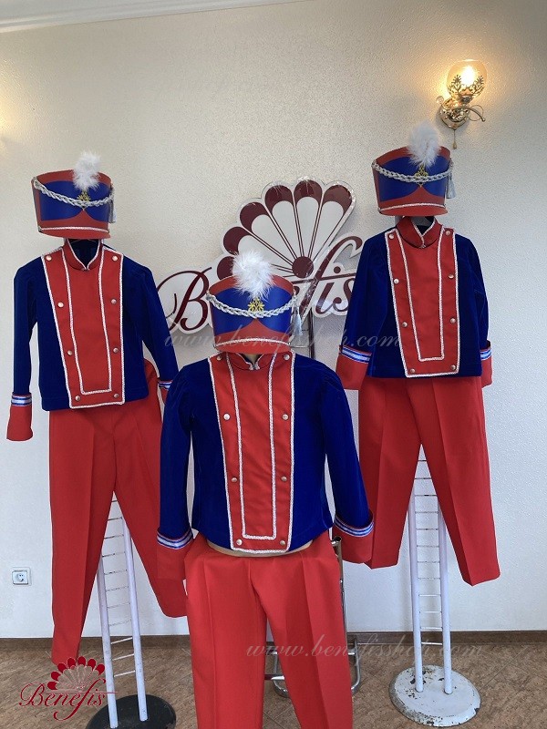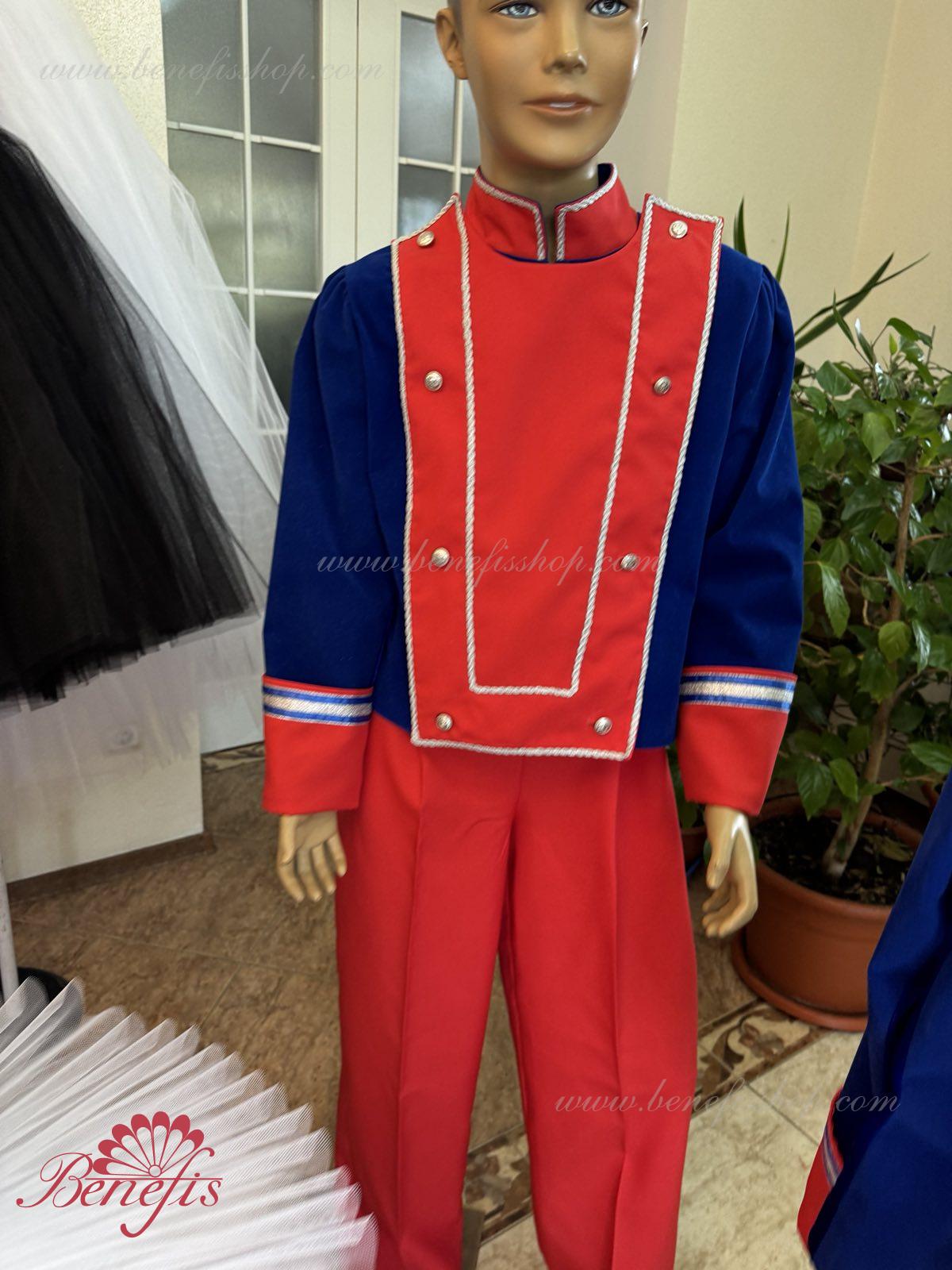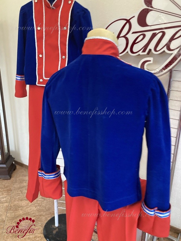 Китель выполнен из бархата со вставкой на груди из габардина. Вставка украшена тесьмой и пуговицами.