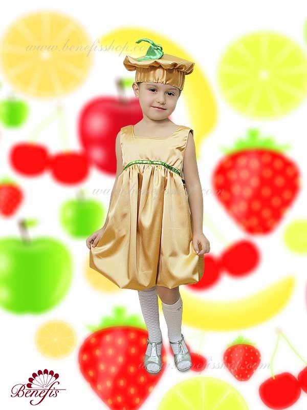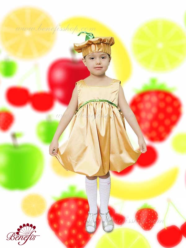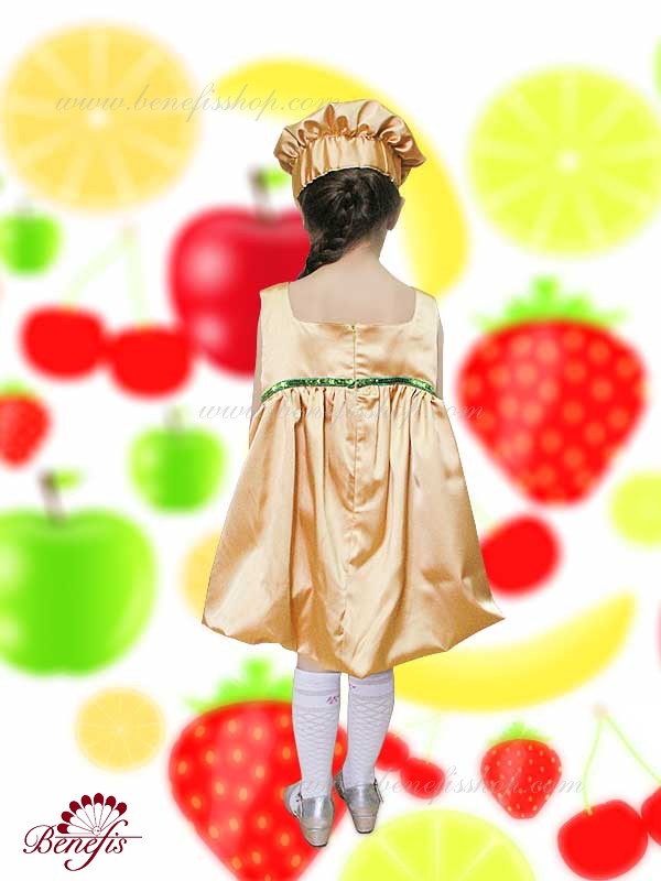 Костюм изготовлен из атласа. Украшением служит декоративная лента зеленого цвета на платье.