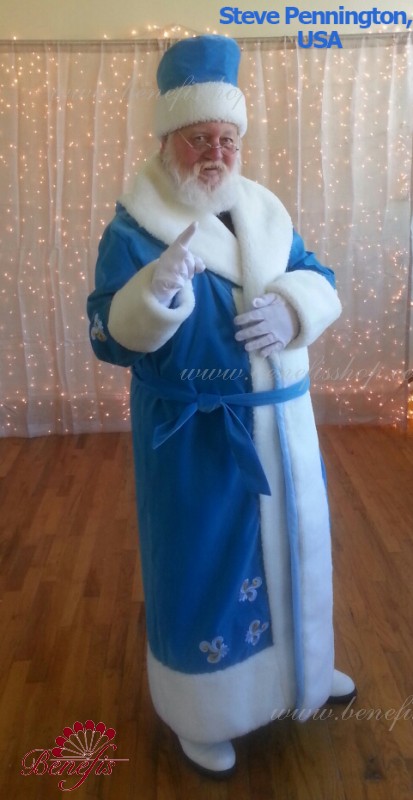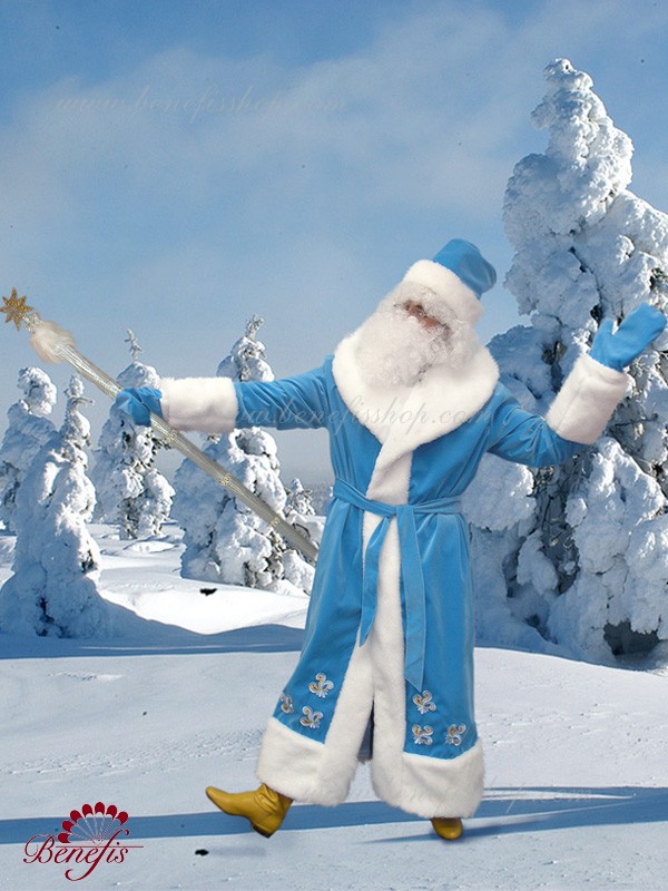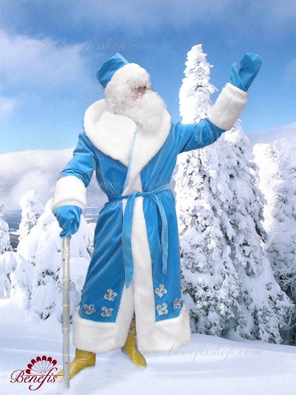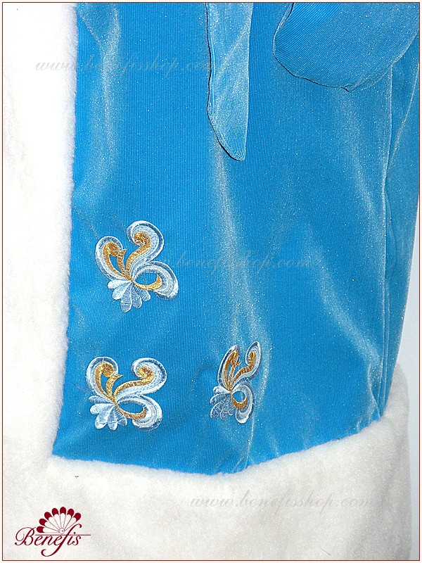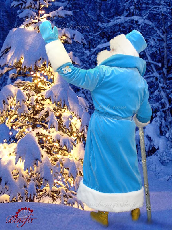 Халат на подкладке затягивается поясом из той же ткани. Белый воротник плавно переходит в широкую меховую оторочку по краям халата. Рукава и шапка оторочены белым мехом.