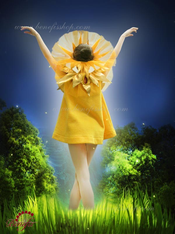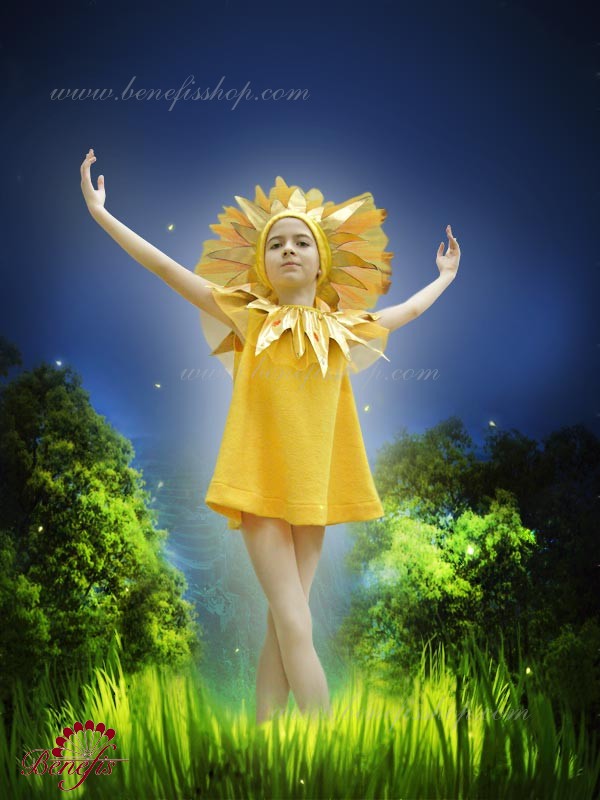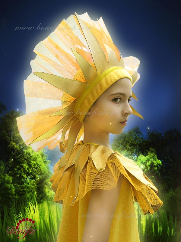 Выполнена на основе эластичного купальника и пристроченной к нему юбки. Юбка изготовлена из 4 слоёв мягкого и жёсткого тюля разной длины и присобрана на купальнике. За счёт особой технологии изготовления, пачка сохраняет пышность, волнистые очертания. Купальник на лямках выполнен из бифлекса. Купальник, юбка и головной убор украшены блестящей тканью в виде солнечных лучей.