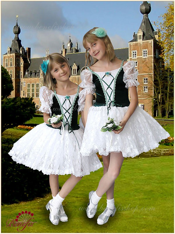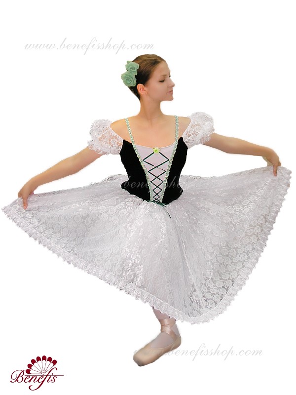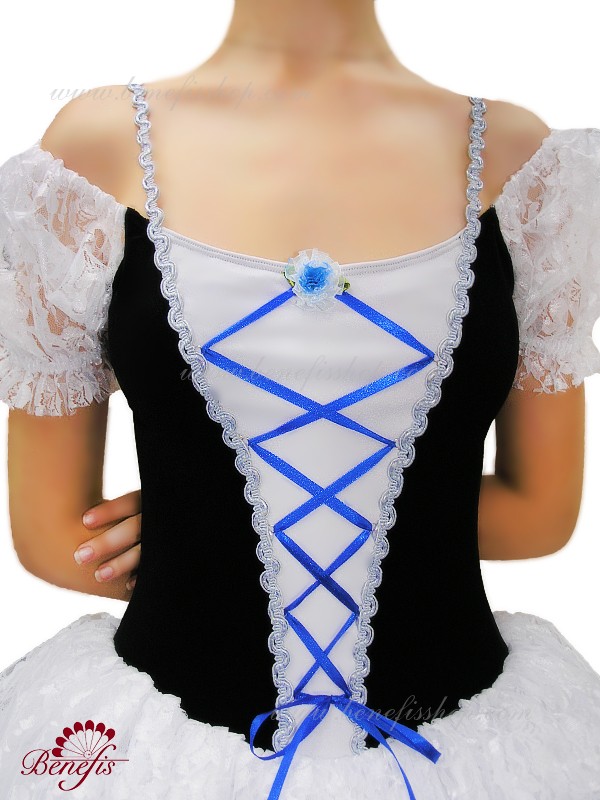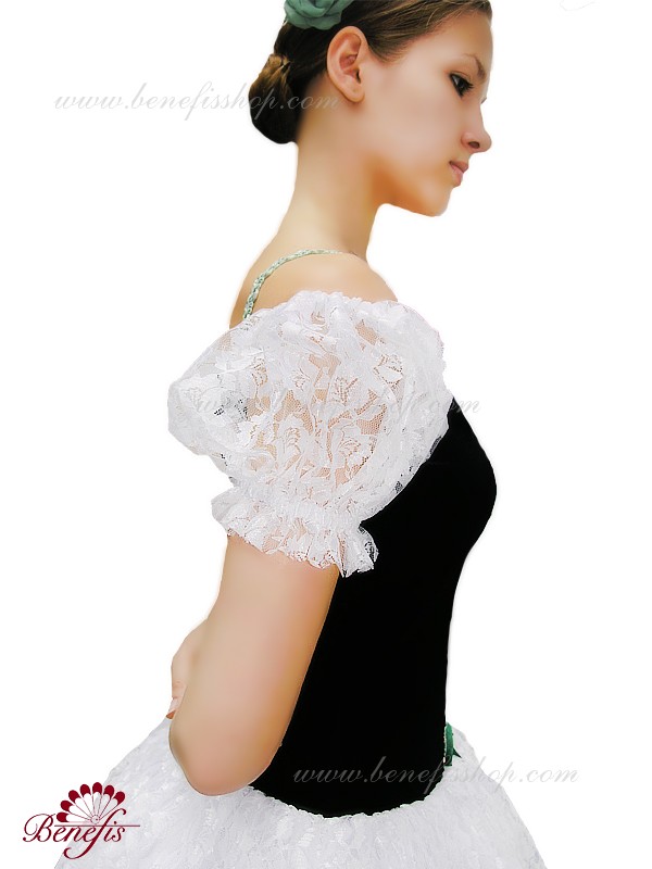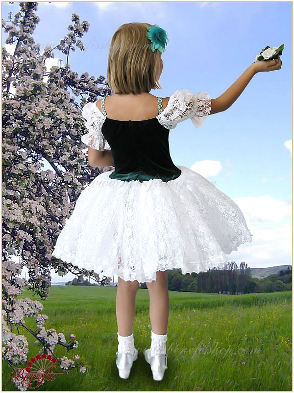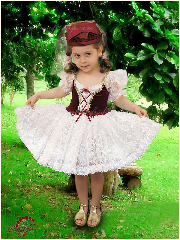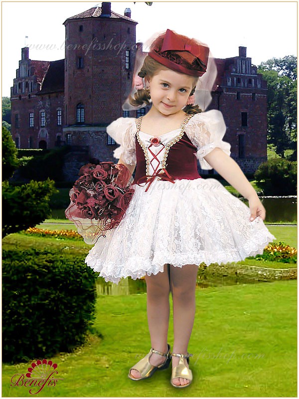 Лиф платья выполнен из бархата с белой вставкой впереди. Лиф украшен шнуровкой и тесьмой, а так же цветочком в тон. Приспущенные рукавчики на резинке и верхний слой юбки выполнены из гипюра. Юбка оторочена кружевами. Нижние слои юбки выполнены из тюля.