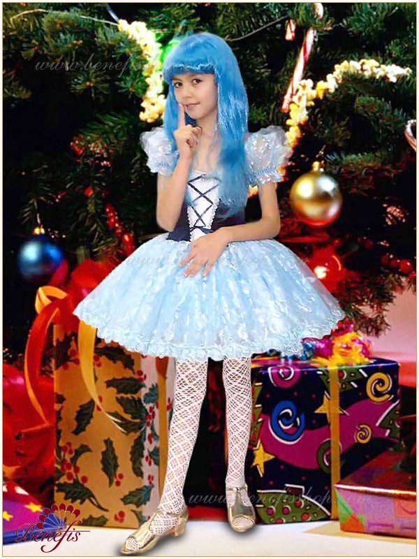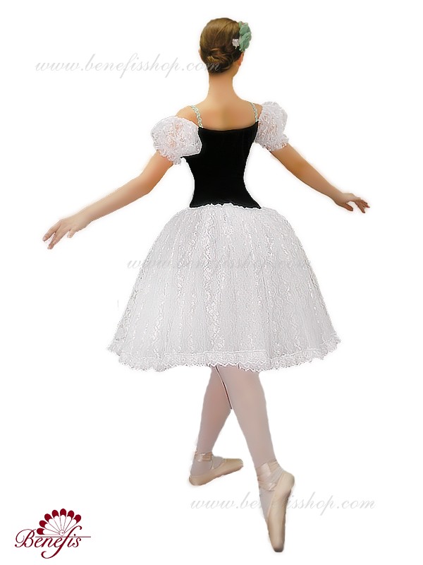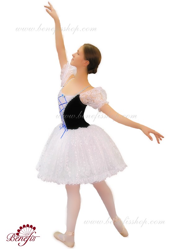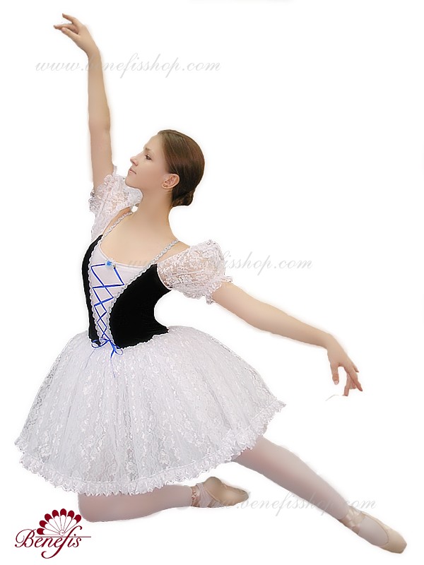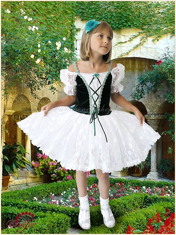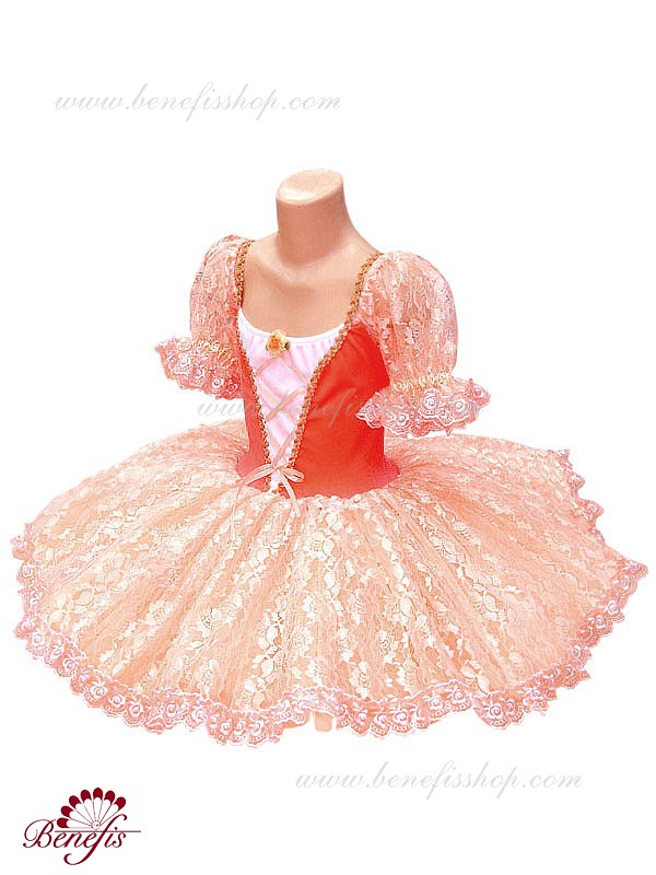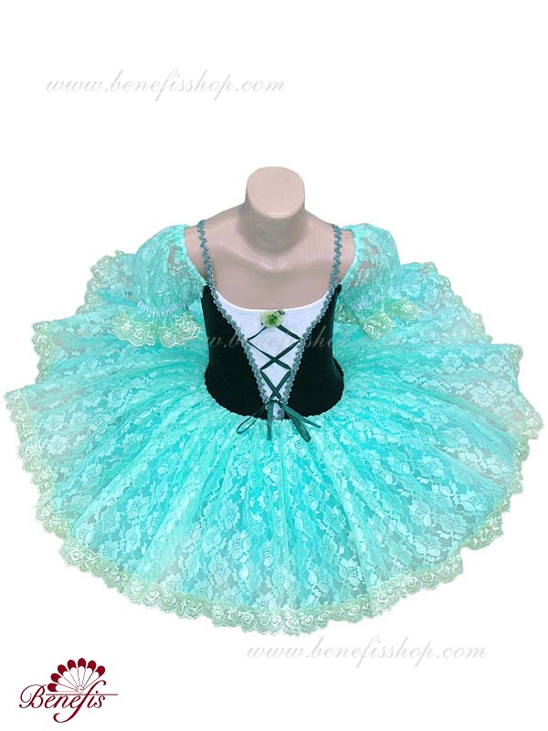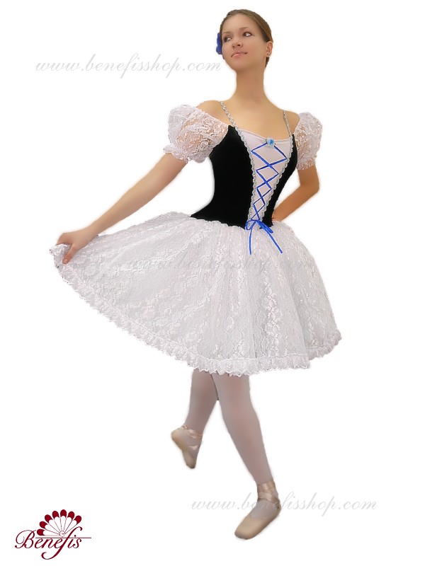 Лиф платья выполнен из бархата с белой вставкой впереди. Лиф украшен шнуровкой и тесьмой, а так же цветочком в тон. Приспущенные рукавчики на резинке и верхний слой юбки выполнены из гипюра. Юбка оторочена кружевами. Нижние слои юбки выполнены из тюля.