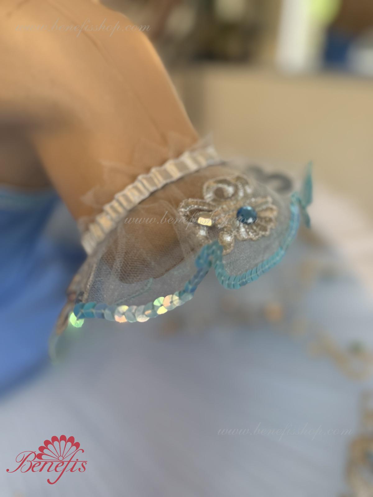 В качестве декора костюма использованы аппликации в виде изысканных узоров, а также большое количество блёсток, страз, бисера и стекляруса.
