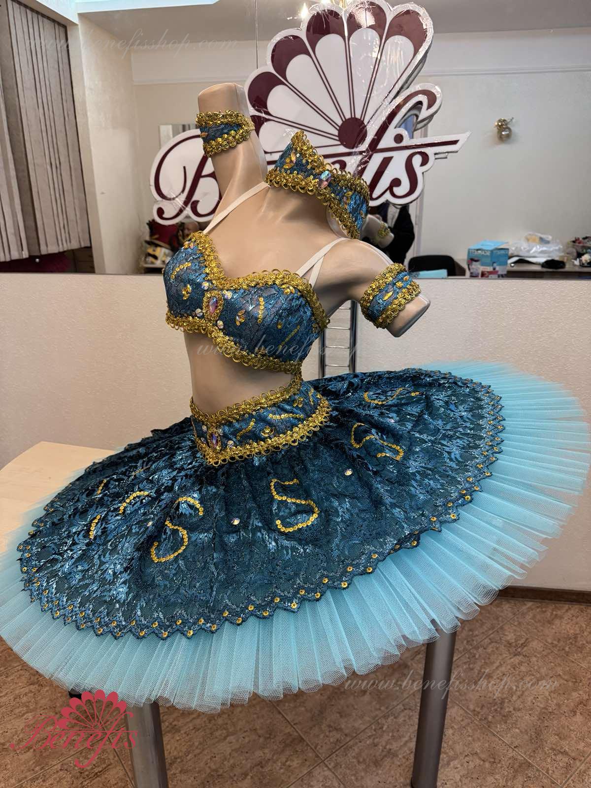 Роскошный балетный костюм выполнен в лучших восточных традициях. Укороченный лиф выполняется отдельно от юбки пачки, которая одевается на бёдра.