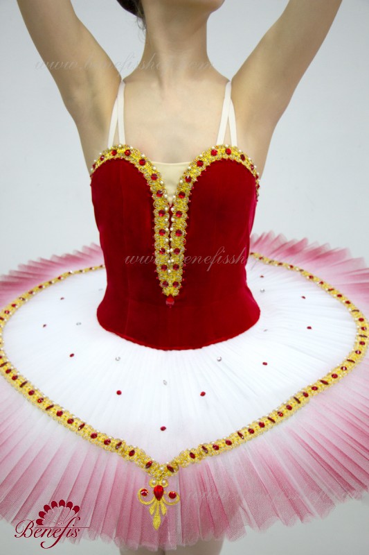 Лиф застегивается на крючки в два ряда для удобного регулирования, внутренний шнур служит для затягивания лифа в области груди. Восемь плиссированных градуированных слоёв полумягкого тюля- семь длинных и один короткий на трусиках из тюля с 10 см кокеткой, прикрепленной к эластичному поясу. Два кринолиновых обруча внедрены в средний слой с двумя дополнительными короткими оборками по краям. Длина верхнего слоя - 36-38 см, каждый следующий слой на 4 см короче. Пачка застегивается сзади на 6 больших крючков и петелек. Декор: тесьма, аппликации, стразы, блестки.