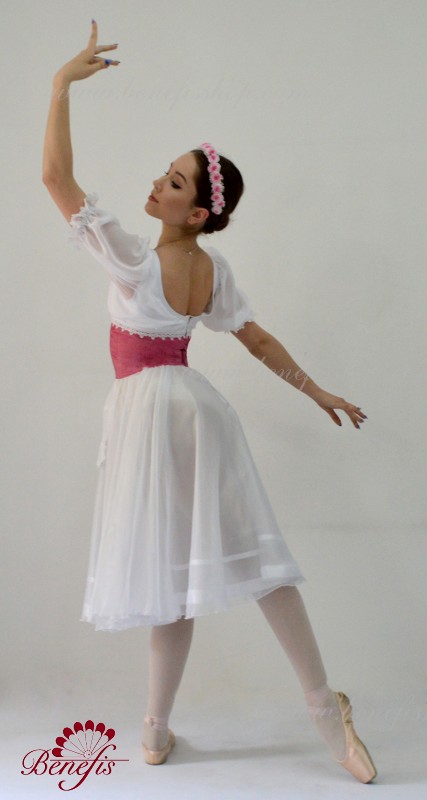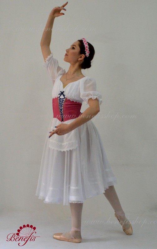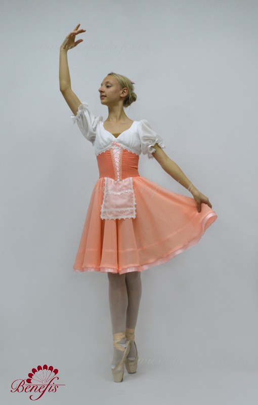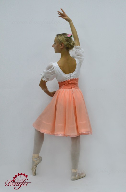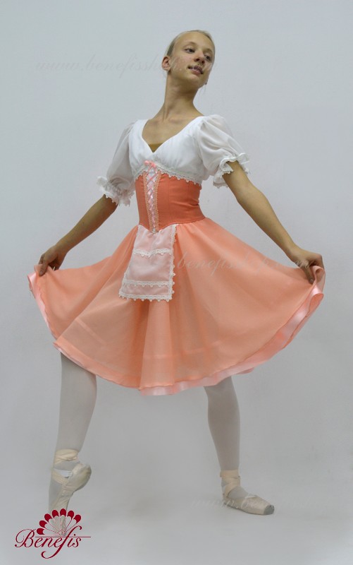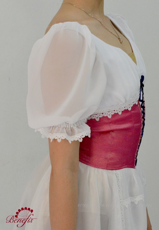 Костюм состоит из плотного лифа из полуэластичной ткани двух цветов. Верхняя часть лифа дублирована легким шифоном с рукавами фонариками.