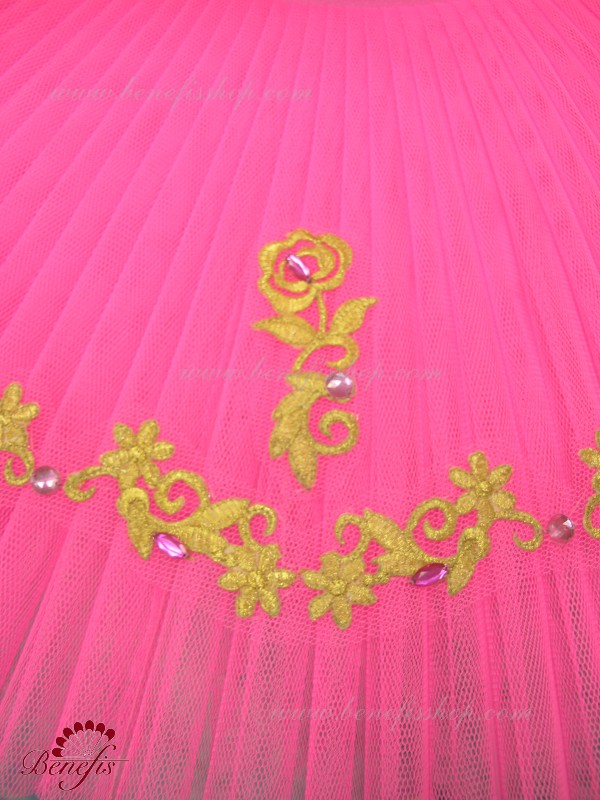 На лифе и верхнем слое юбки выполнен декор в виде узоров из аппликаций, блёсток и страз разной величины.