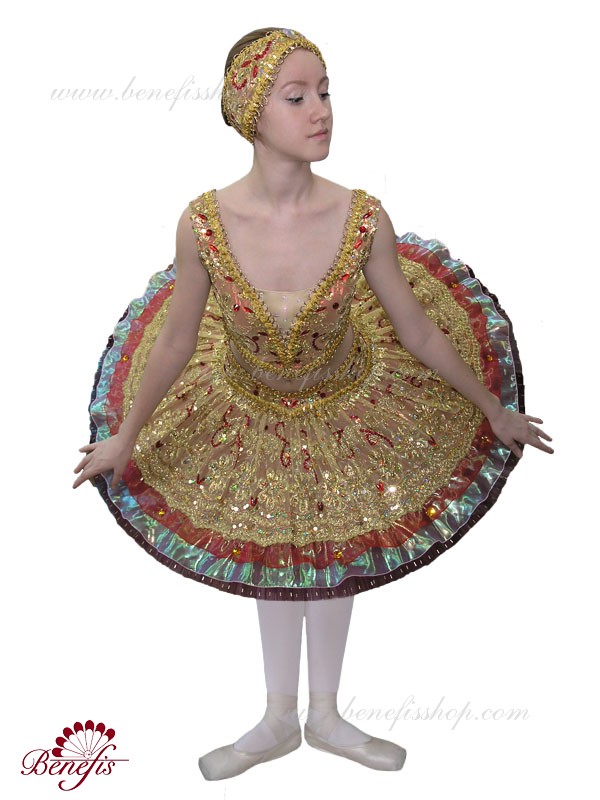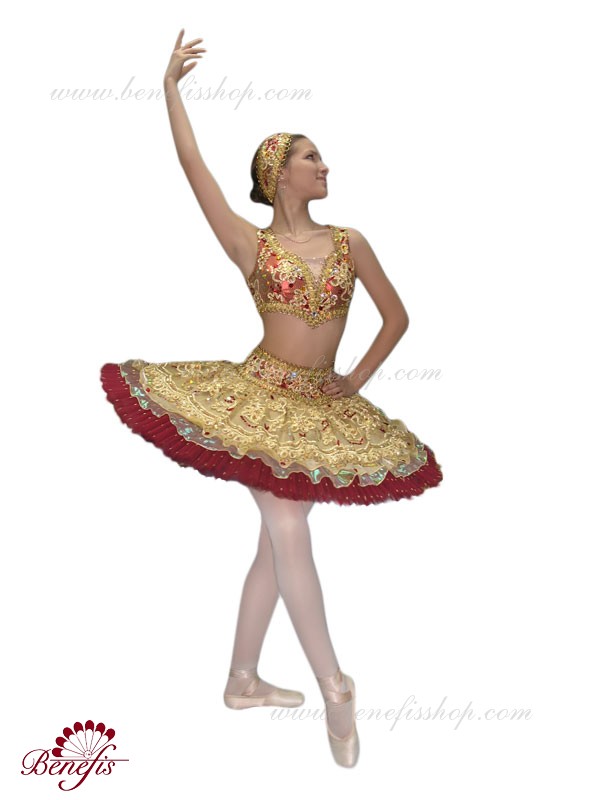 На юбке выполнена многослойная покрышка из ткани разной фактуры, поэтому костюм особо красочен и может быть использован для роли Одалиски в балете «Корсар» а также в балете «Баядерка».