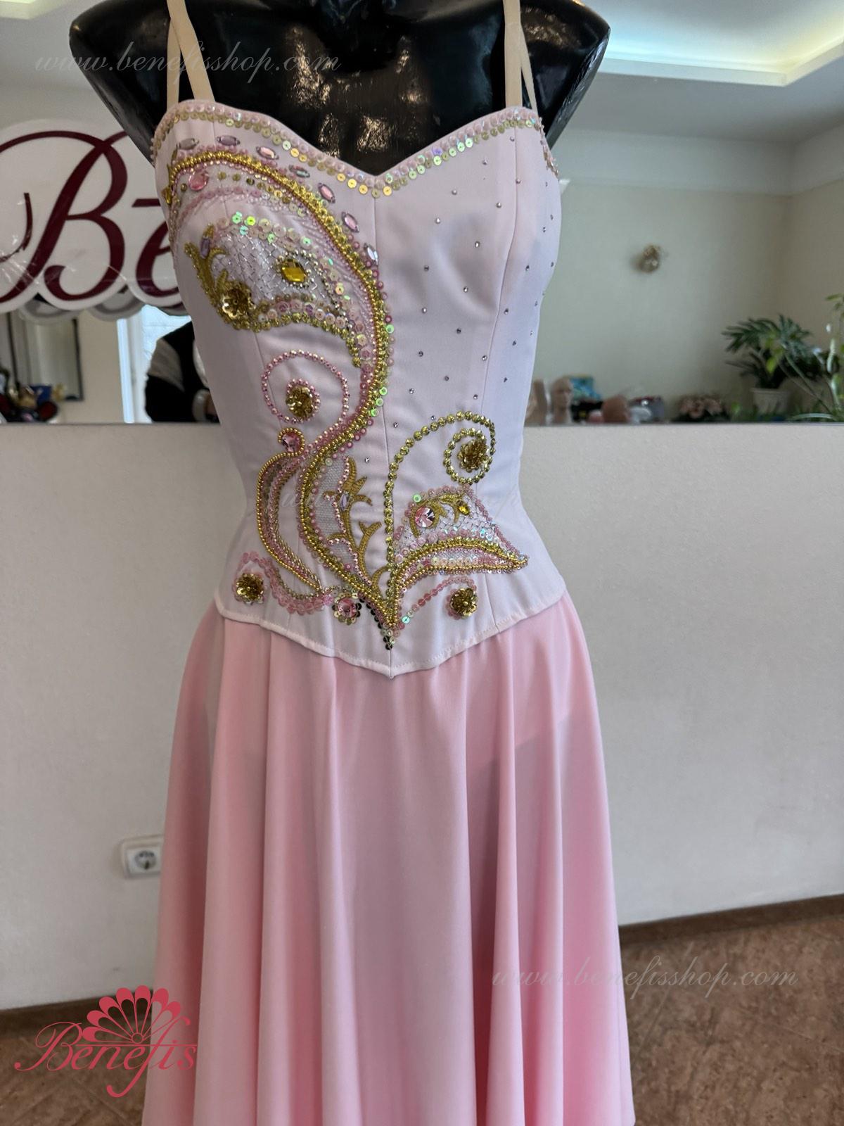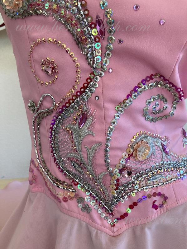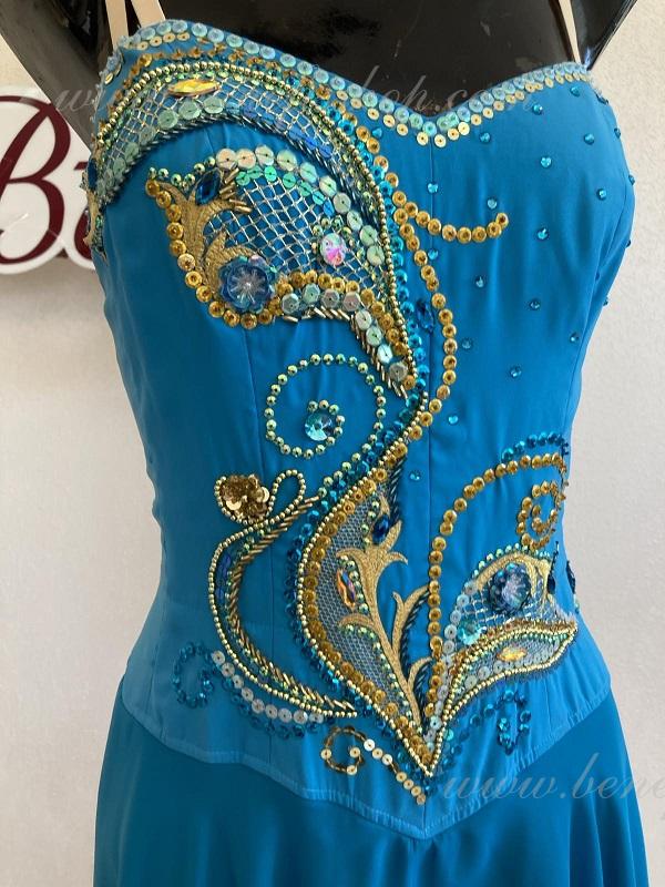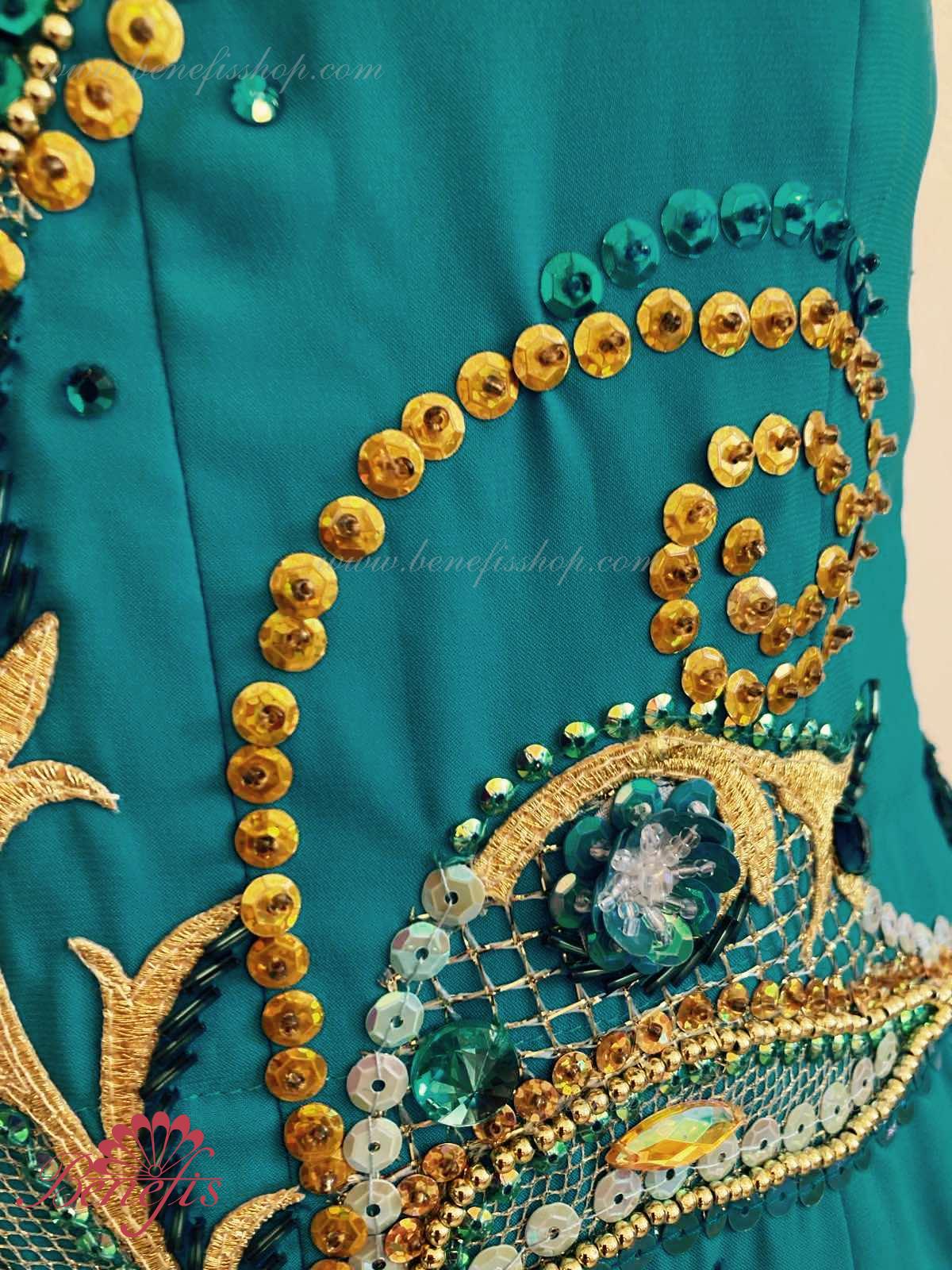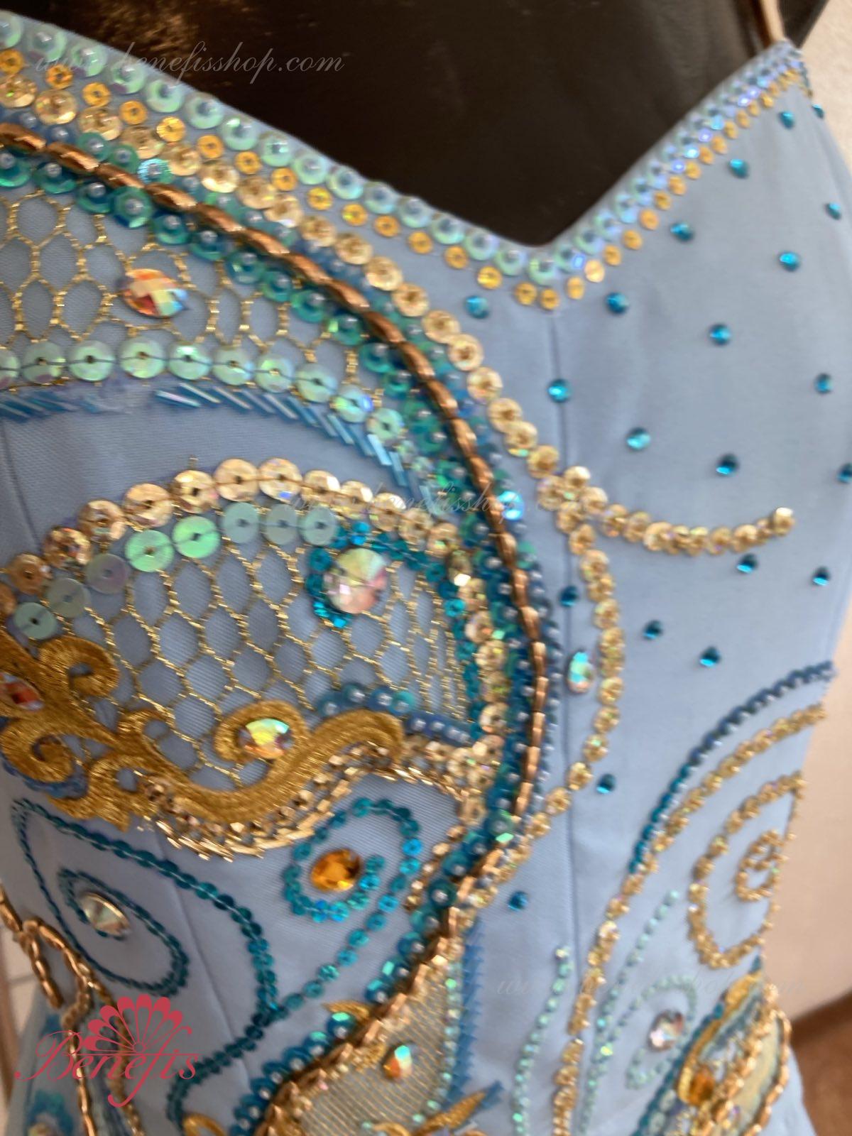 Лиф богато декорирован аппликациями, украшен тесьмой, стразами, блестками и бисером и застегивается сзади на крючки. Для украшения юбки использовано множество мерцающих блесток.