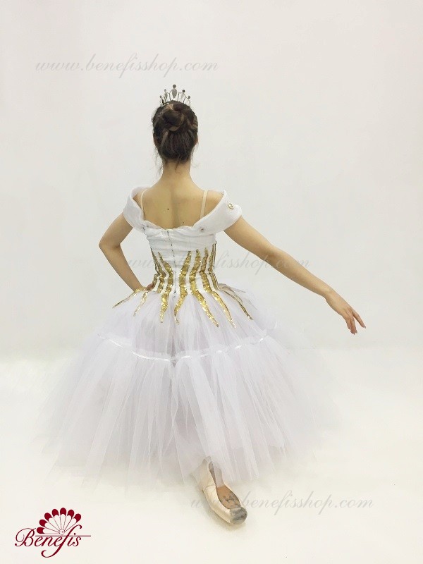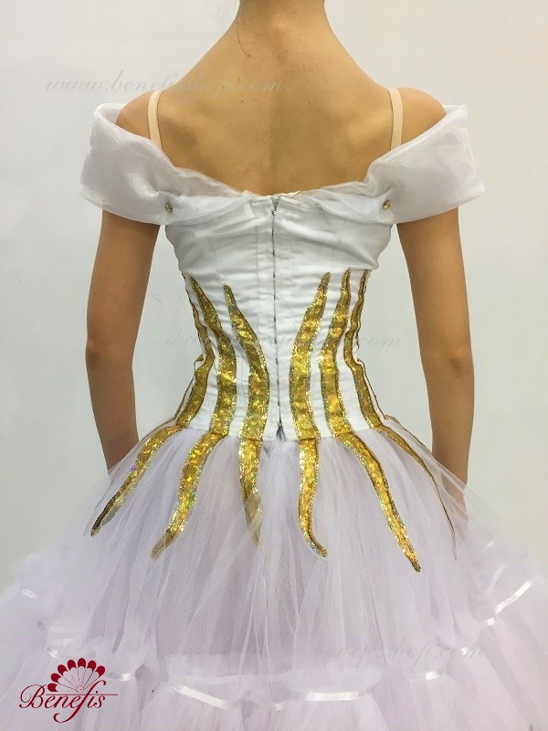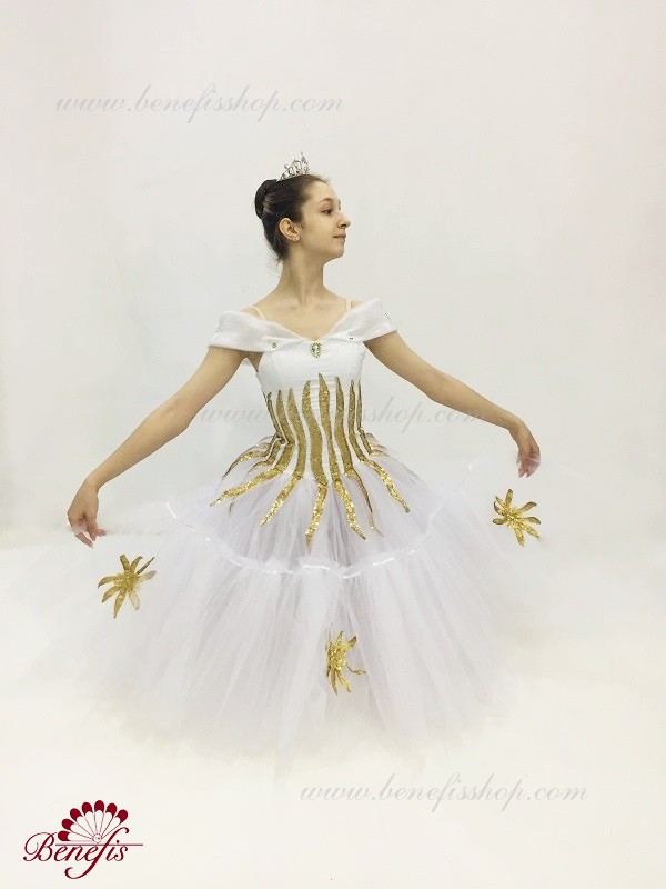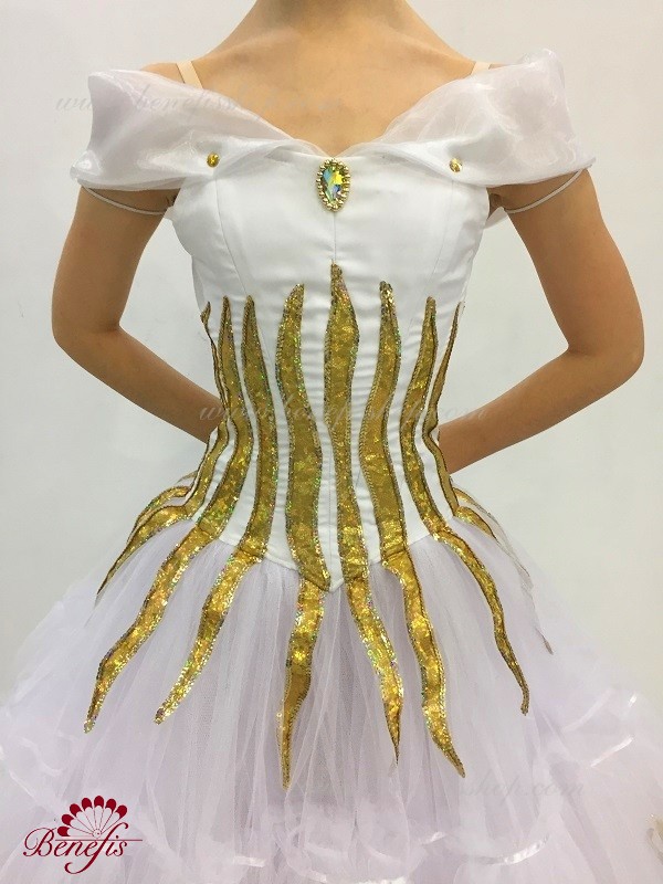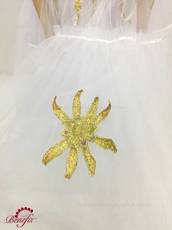 Детали: платье. Это профессиональный, сценический, балетный костюм. Лиф которого изготовлен из полу эластичной плотной ткани и рукавов из органзы. Верх изделия основан на базовой модели T0009. Костюм застегивается на два ряда крючков и петель. Юбка из нежного шифона. Декор из блестящего бифлекса, блесточной тесьмы и камней. Юбку украшают блестящие звезды.