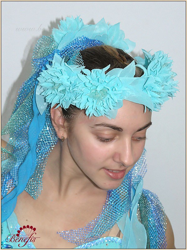 Головной убор выполнен в форме веночка из искусственных цветочков и ленточек из декоративной сетки.